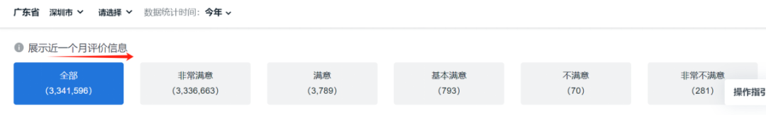 从收到的评价信息来看,近一个月,深圳市共收到3,341,596条有效评价,其中:非常满意占99.85%,满意占0.11%,基本满意占0.2%,不满意占0%,非常不满意占0.01%,深圳政务服务机构以高效、便捷、优质的服务,从整体上赢得了广大群众的“好评”。