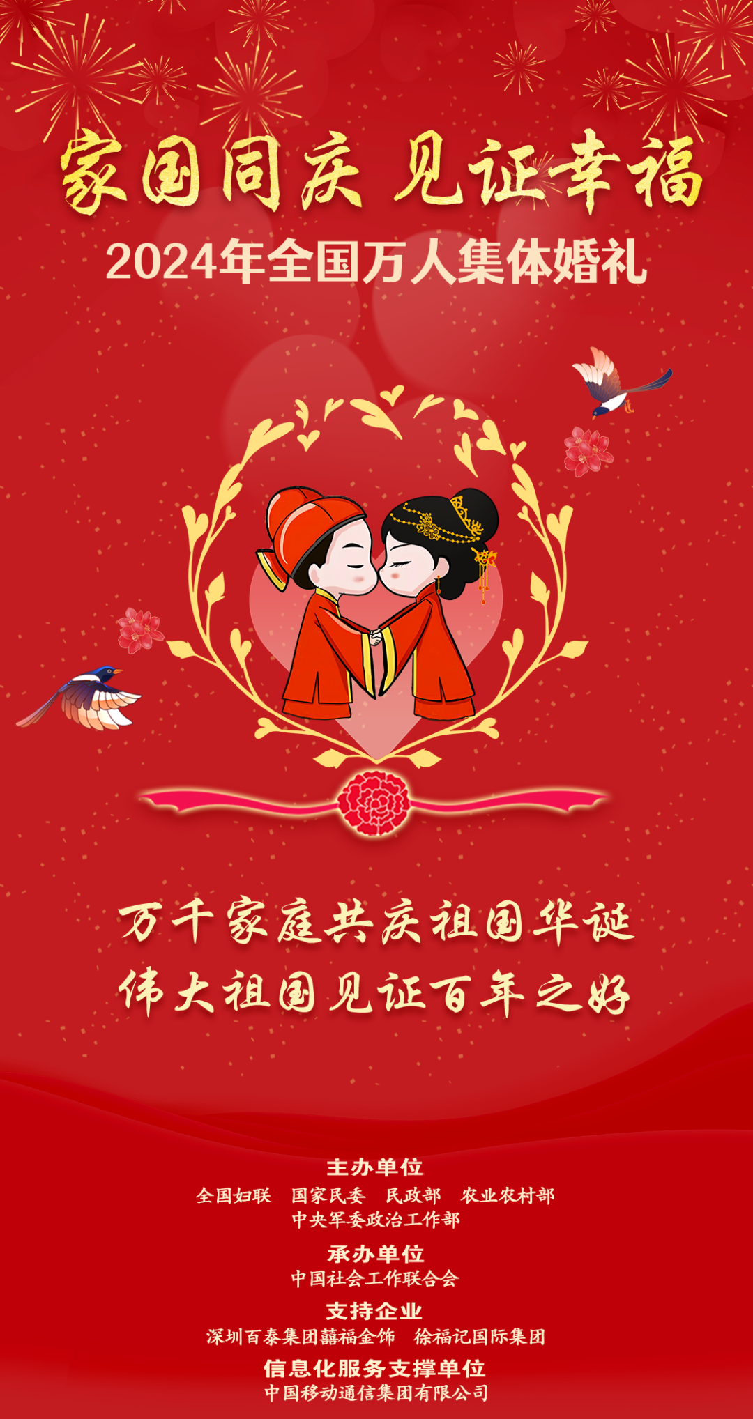 日前,全国妇联宣布联合中央有关部门于9月在北京主会场、各省区市和新疆生产建设兵团等多个分会场同步举办“家国同庆 见证幸福”2024年全国万人集体婚礼。