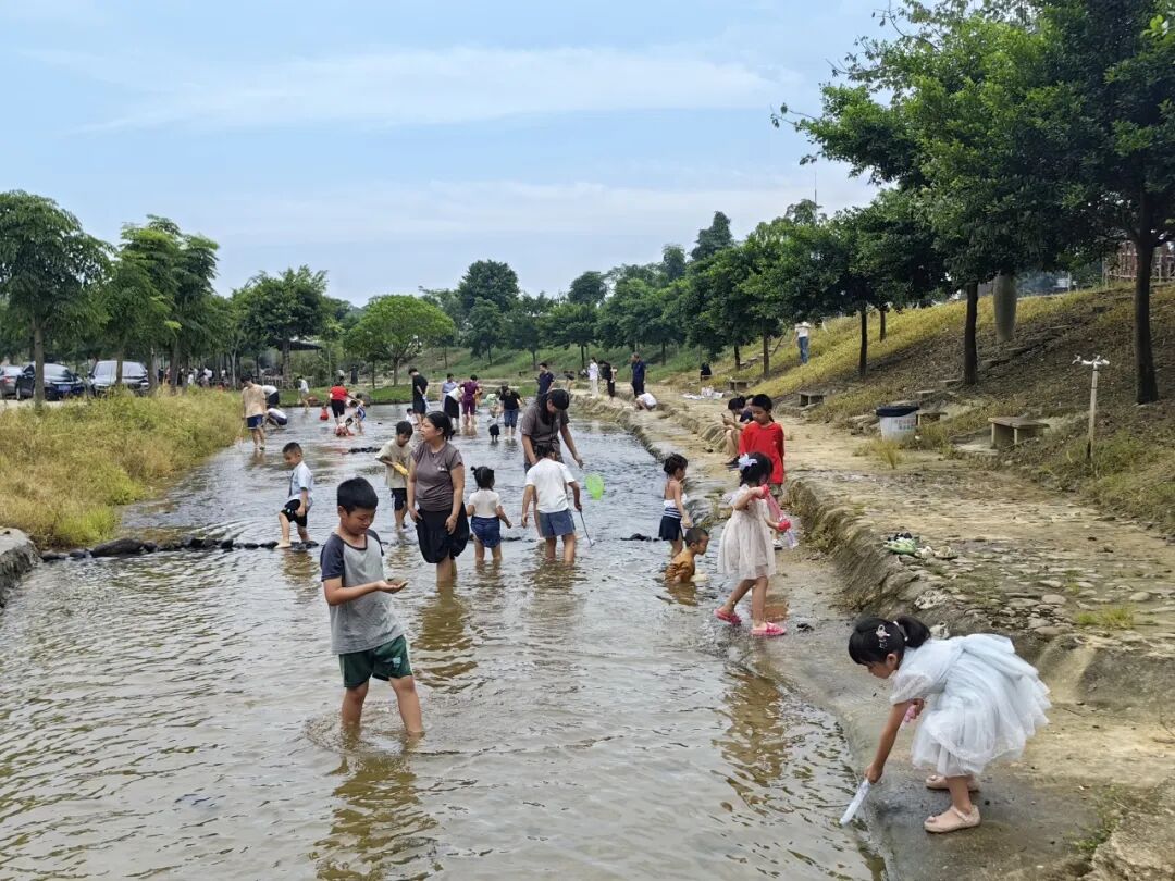 溪水潺潺,清凉透心,小孩子们欢声笑语,在簕菜文化创意园尽情嬉戏。他们或弯腰捉鱼,或泼水打闹,水花四溅中洋溢着纯真的快乐。