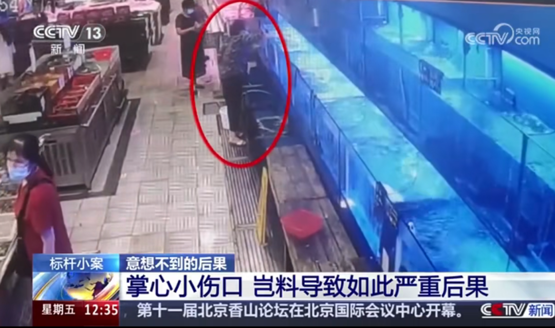我们可以在超市的监控里看到,王女士在生鲜鱼货的水箱前选购鱼,在把鱼装进袋子时,发生了意外,跳动的鱼刺伤了王女士的手掌。