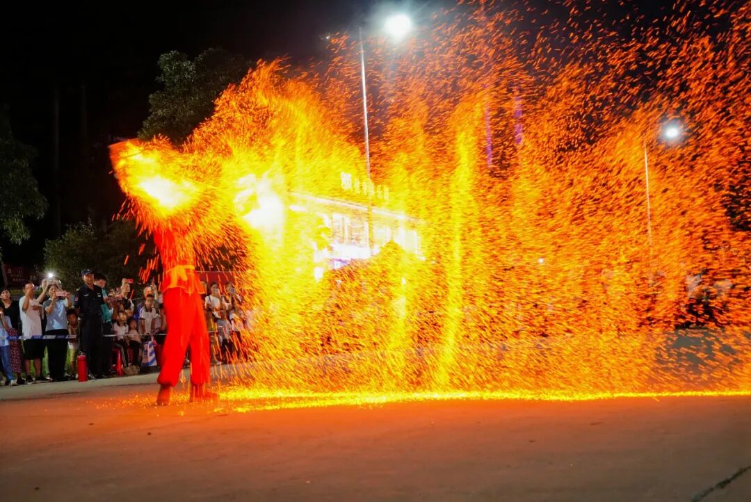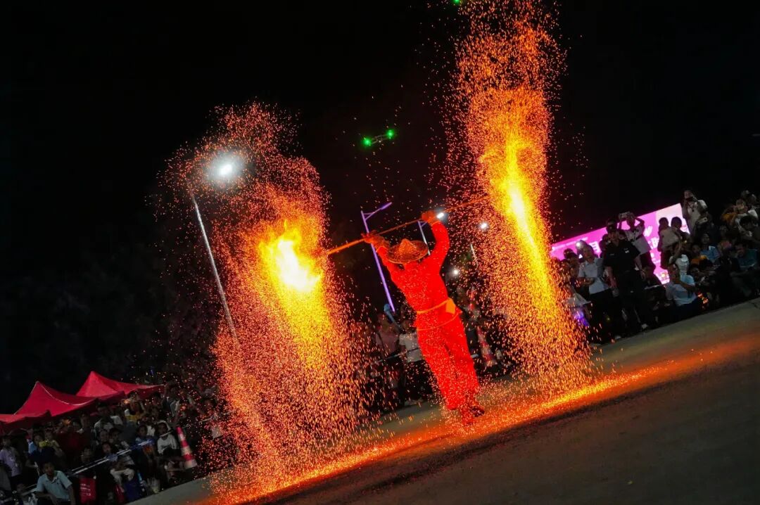 令人印象深刻的非物质文化遗产——火壶表演让活动达到高潮。火壶表演是一种将操纵火焰的技巧与艺术相结合的表演形式,表演者会将烧好的木炭放入两边的铁网,然后通过抖动铁网使炭火产生火花,呈现出“火树银花”般的美丽画面。