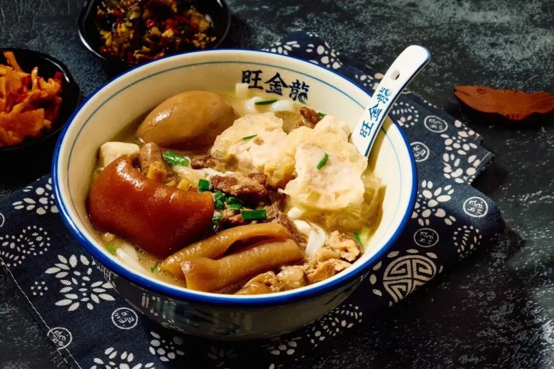 【惠阳老字号】旺金龙汤粉店品牌始创于1992年,其招牌产品“金镶肉”,由一层金黄的猪皮包裹着用上等猪肉打成的肉皮馅,吃起来口感丰富、鲜甜味美,搭配着汤粉刚刚好。曾上过中央电视台,也拿过广东省“广东好味道”比赛金奖。
