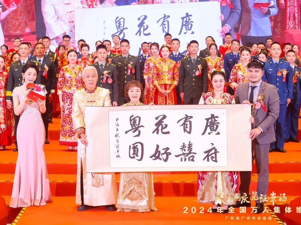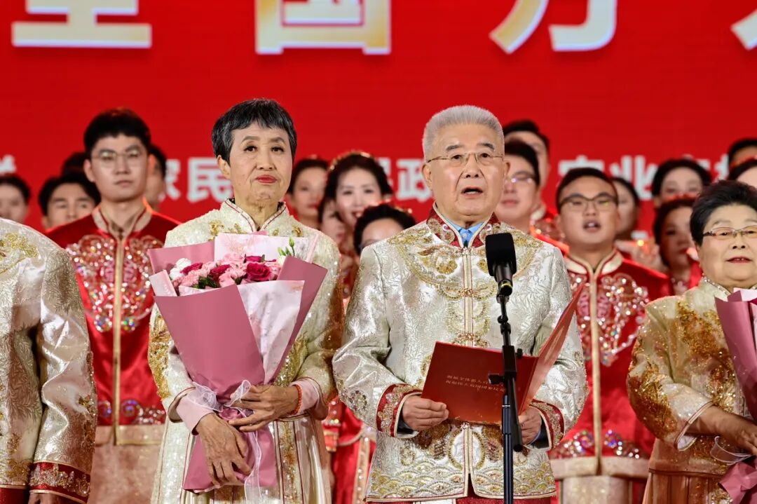 主分会场互动连线,全国万名新人同步举行中式婚礼拜堂仪式,共同许下风雨同行、相知相守、家风润心、向上向善、修身立业、胸怀家国的誓言。新人代表发出抵制高价彩礼、婚事新办简办,争做中华传统美德的传承者、新型婚育文化的引领者、社会主义家庭文明新风尚的践行者倡议。全国道德模范、全国文明家庭等先进典型代表、各行各业社会各界代表、金婚伉俪代表为所有新人送上美好祝福,新人们合唱《歌唱祖国》,传统而热烈的婚礼在祖国的见证下和来自大江南北的祝福声中圆满礼成。