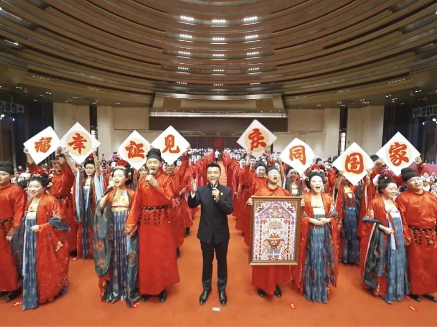 各会场精彩纷呈,广东广州设置婚俗文化展,把代表广府婚俗历史文化变迁的喜文化纳入展陈,展示婚俗礼仪;福建福州邀请6对台胞新人参加,成为深化两岸情感融合的有力印证;重庆将婚礼向婚恋延展,现场邀请未婚青年观礼;陕西西安新人们身着唐制婚服,穿过六国元首共植的友谊树,在中国-中亚峰会的主会场许下相守誓言......各地纷纷将优秀传统文化、移风易俗等家庭文明建设内容融入集体婚礼环节,以中式婚礼弘扬婚事新办简办新风貌。