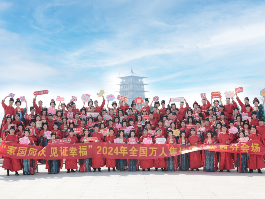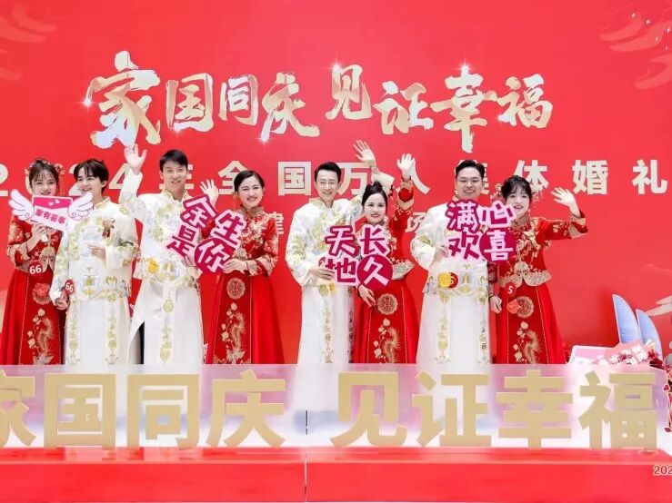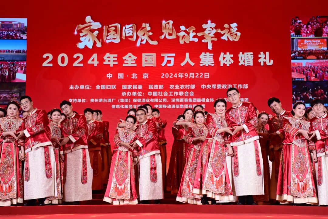 9月22日,全国妇联联合国家民委、民政部、农业农村部、中央军委政治工作部,在北京主会场、各省区市49个分会场举办“家国同庆 见证幸福”2024年全国万人集体婚礼。在中华人民共和国成立75周年之际,全国5105对新人参加这场规模盛大的中式集体婚礼,寓意万千家庭共庆祖国华诞, 伟大祖国见证百年之好。全国妇联党组书记、副主席、书记处第一书记黄晓薇为新人证婚。民政部党组书记、部长陆治原为新人主婚。