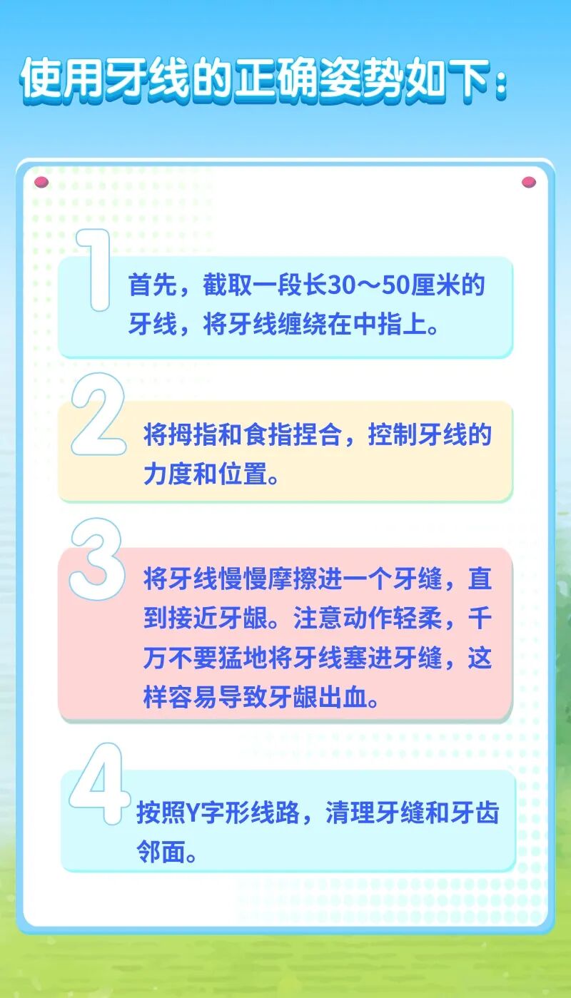 牙线大致分为含蜡和不含蜡的,膨胀和不膨胀的。含蜡牙线就是牙线上裹一层蜡,它比无蜡牙线更容易滑进牙缝。膨胀牙线遇水会膨胀成海绵状,以减少对牙龈的刺激。牙线的形状也有很多种。扁平牙线可以增大牙线与牙齿的接触面,更好地清洁牙缝间的牙菌斑和牙垢。圆形牙线更适合牙缝大的人。如果牙间隙比较小,可选择扁宽线且遇水不膨胀的牙线,阻力小。