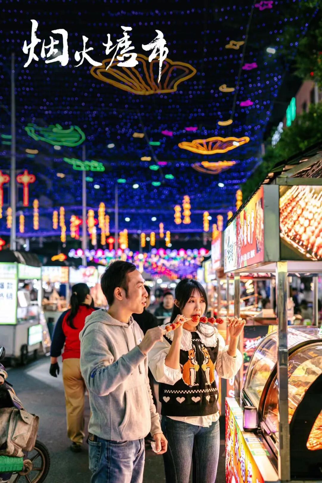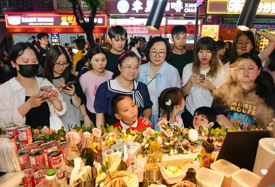 夜市于6:00至次日6:00开放,超过300个特色摊位错落有致,从传统小吃到创意饮品,从非遗到现代文创,每一处都充满了惊喜。游客们穿梭于摊位之间,或是品尝着热腾腾的小吃,或享受茶饮鲜果,或是挑选一件别致的手工艺品,惬意极了。