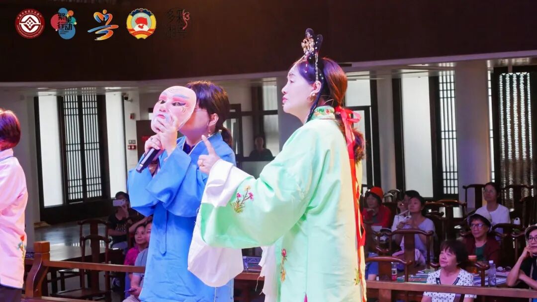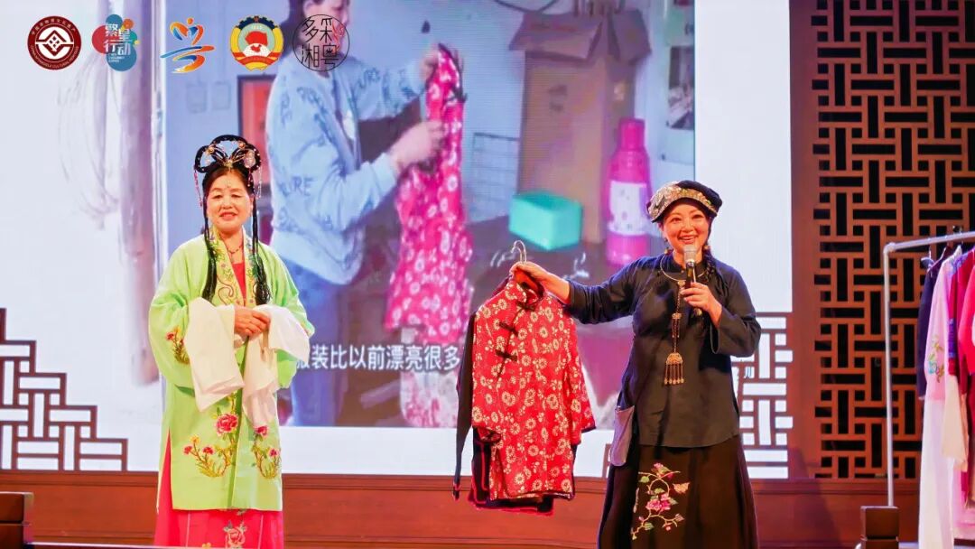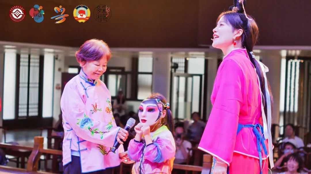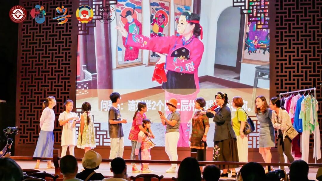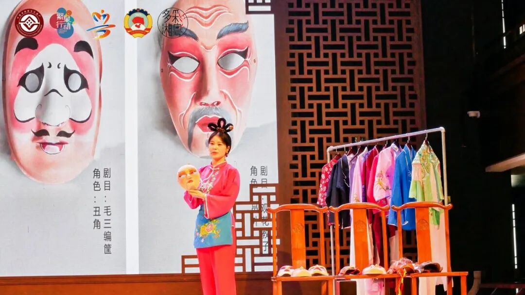 随着课堂的进度,观众们的好奇心和求知欲被逐渐点燃,此时金玲老师随机抽取10名幸运观众上台参与互动,他们个个兴致勃勃,跃跃欲试,紧随着传承人的引导,用一种新颖的“抽盲盒”方式,现场学习剧中的经典选段。一只傩面对应一个选段,内容有经典曲目《三妈土地》《八郎卖猪》《钩愿》《姜女下池》《姜女晒衣》《毛三编筐》《观花教子》以及《捡菌子》。戏衣身上穿,傩面头上戴,观众们大展身手,通过互动式的学习体验,皆面带喜色,在轻松愉快的氛围中,亲身体验了一次成为“剧中人”的奇妙之旅。随着传承人的每一次示范,观众们的模仿声此起彼伏,现场洋溢着一种既温馨又热烈的学习氛围。