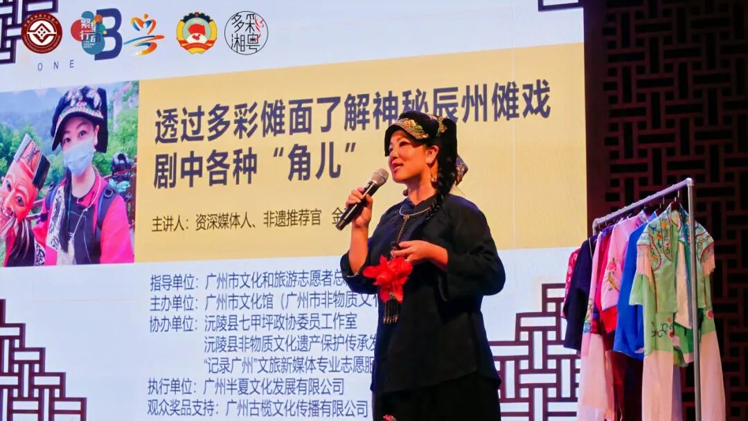 2024年9月25日下午,广州市文化馆曲艺园中心戏台迎来了一场别开生面的文化活动——“非遗课来了· 中国戏剧活化石‘辰州傩戏’,穿越千年演绎古朴风情”。在沅陵县政协委员、资深媒体人、非遗推荐官金玲老师的引领下,我们与湖南省沅陵县国家级非遗项目“辰州傩戏”国家级代表性传承人聂满娥和湖南省沅陵县国家级非遗项目“辰州傩戏”县级代表性传承人、湖南省沅陵县县级非遗项目“辰州傩画”县级代表性传承人李平一同走进了“辰州傩戏”的神秘世界。
