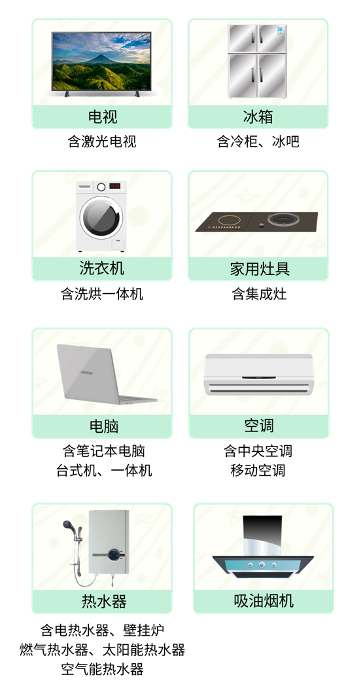 冰箱、洗衣机、电视、空调、热水器、家用灶具、吸油烟机等 |