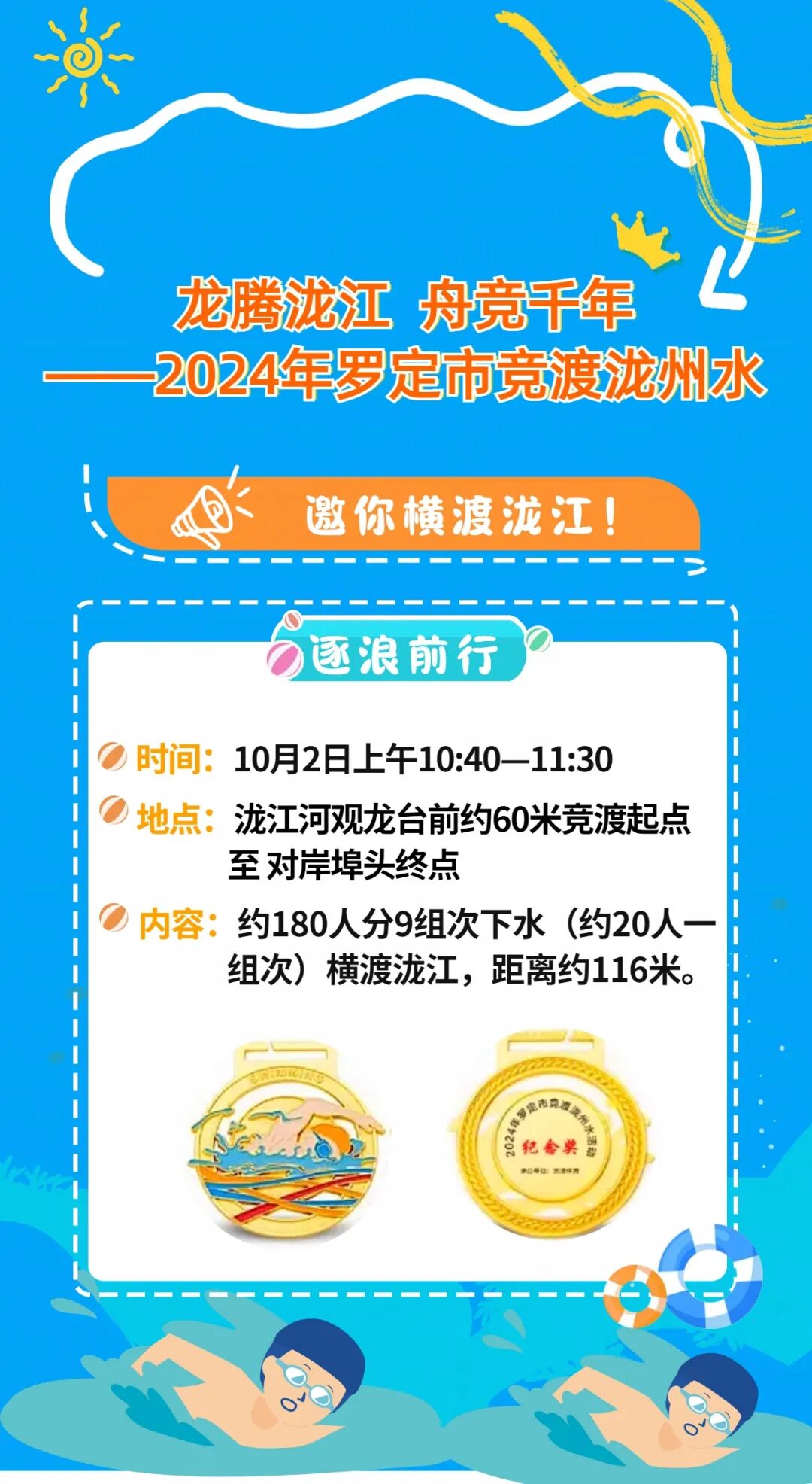 内容:约180人分9组次下水(约20人一组次)横渡泷江,距离约116米。