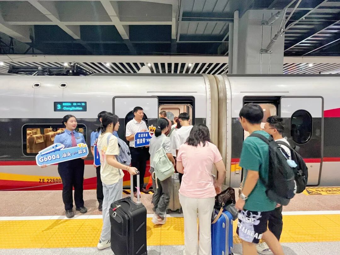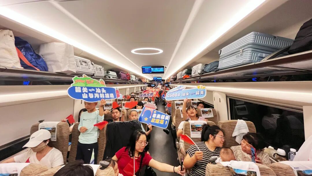 “善美韶关欢迎您”“汕头—韶关 山与海的相遇”……今天清晨6时许,“韶关号”首发式氛围组已上线,活跃在汕头站候车厅、检票口、站台,与旅客们合影互动,仪式感拉满。