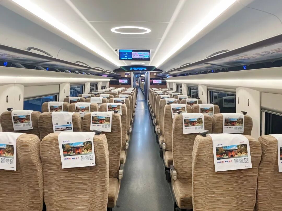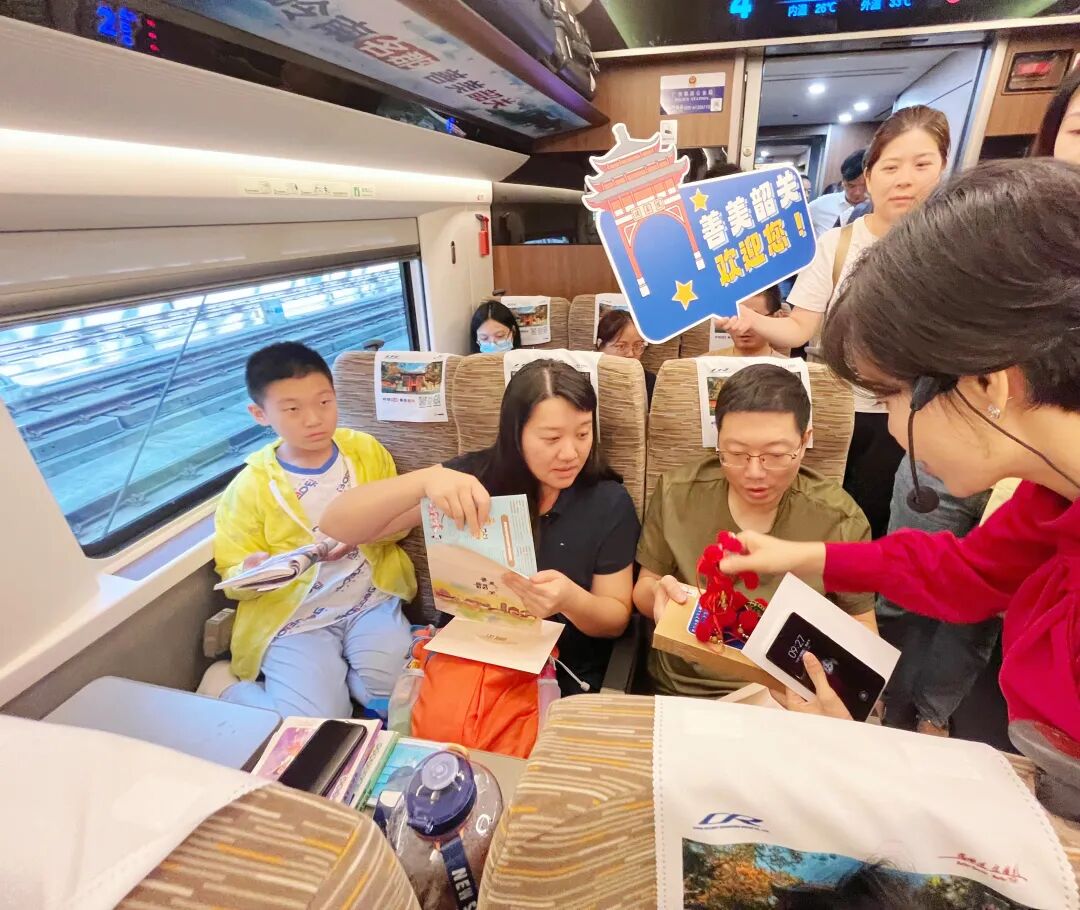 6:52,“韶关号”准时启程,开启一场跨越山海的城市品牌传播与文旅交流盛宴。驰骋的列车成为展示韶关旅游形象的新平台。丹霞山、南华禅寺等韶关文旅名片通过列车播放器、座位头片、桌贴、行李架贴、海报、语音播报等高铁多媒体矩阵向旅客呈现“岭南名郡”的山水文化名城气质,向广大旅客发出“善美韶关欢迎你”的邀约。