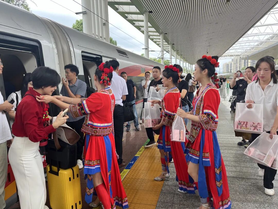 “善美韶关提示您,列车已经到达韶关站。请您下车时注意脚下安全。”10:42,在列车员亲切的播报中,“韶关号”驶达韶关站。在热情洋溢的瑶族迎宾曲中,百余名抵韶旅客走下“韶关号”,并收到了韶关文旅送出的精美手信。“韶关的朋友太热情了!第一次来就收到这么多礼物,太有心了!”来韶参加朋友婚礼的林先生说。