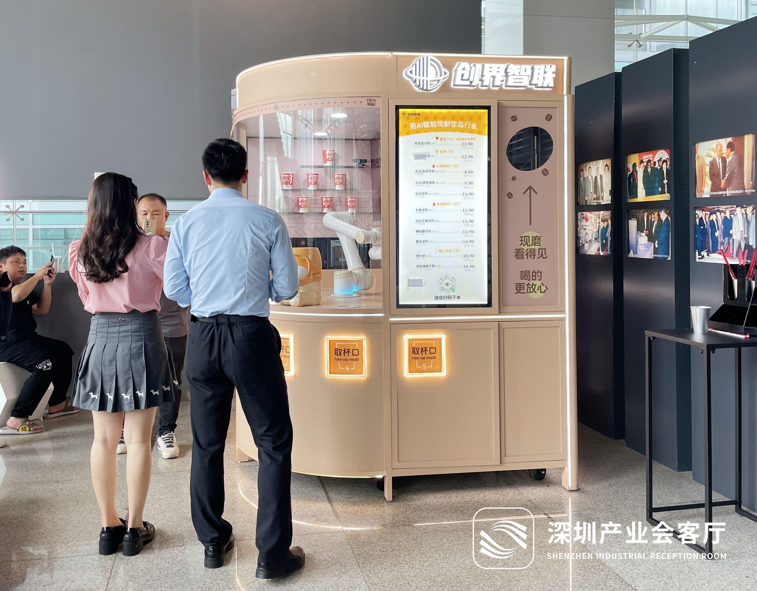 入口处的“创界智联AI饮品站”,吸引了不少游客驻足。24小时无人化经营、最快1分钟出杯——8元一杯的“智慧咖啡”,在深圳市工业展览馆提供的场景展示平台上,展现着AI智能饮品机器人未来的发展潜力。