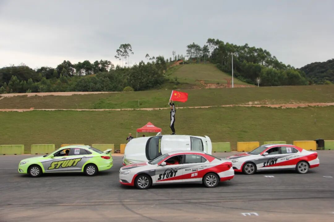华家班赛车主题公园汽车特技表演庆祝新中国成立75周年。