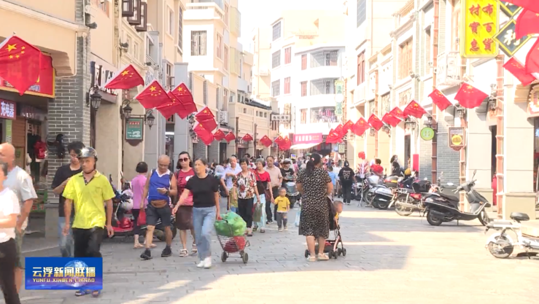 在云城区大街小巷,国旗招展,中国红格外醒目,国庆节日气氛浓厚。道路两旁的商户们也纷纷在店门口悬挂起五星红旗,那一抹红色,如同一颗颗炽热的爱国之心在跳动。鲜艳的五星红旗和喜庆的红灯笼,成为了最亮丽的风景,吸引市民用手机记录着喜庆的氛围感。
