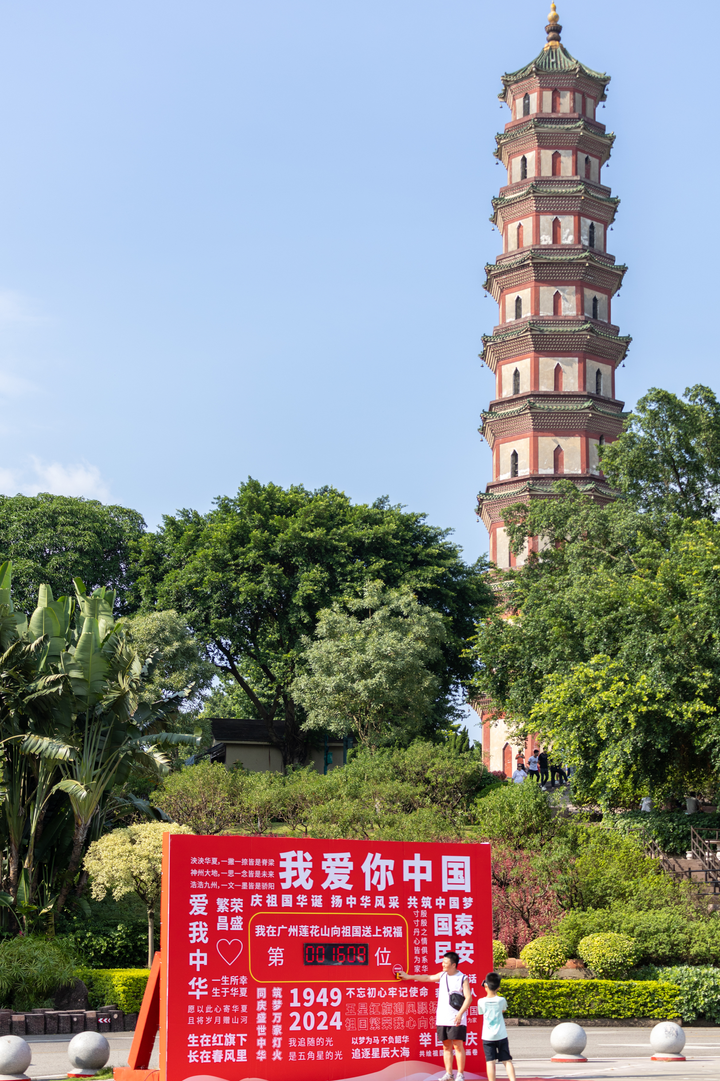 而在山顶牌坊广场,“我为祖国送祝福”巨幅红色打卡墙格外醒目,墙上设有互动按钮和动态显示屏,实时显示在莲花山为祖国送出祝福的总人数。前来打卡的市民游客纷纷与这抹涌动着拳拳爱国情的中国红合影留念,同时按动按钮,定格在莲峰福地为祖国送祝福的专属印记。“能在这里为祖国送上祝福,我感到非常自豪。希望我们的国家越来越强大,也祝愿家人朋友们都健康平安。”一名游客说。