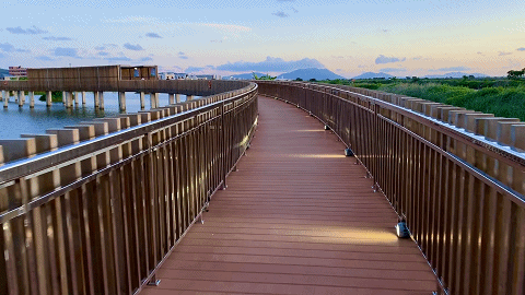 走在塑木板铺设的桥面上,可以欣赏郁郁葱葱的花木,眺望亲水生态美景,感受一份心旷神怡的宁静,亦或是在休闲驿站畅谈言欢,远离城市的喧嚣。