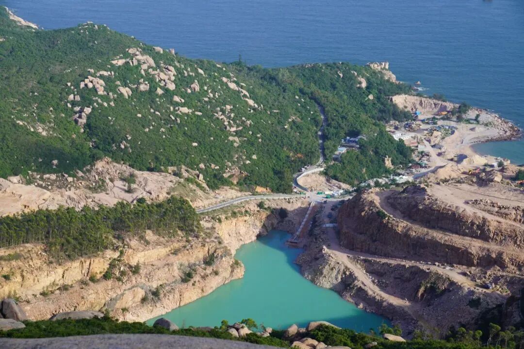 视线来到石阶小径终点,塔湾石场片区。这里的矿山经过生态修复工程后焕然一新,矿山之间,有一湾翡翠碧湖,旺季游人如织,临湖打卡留念。层次分明的矿山上,生长着木麻黄、台湾相思树、三角梅等植被,绿意盎然。