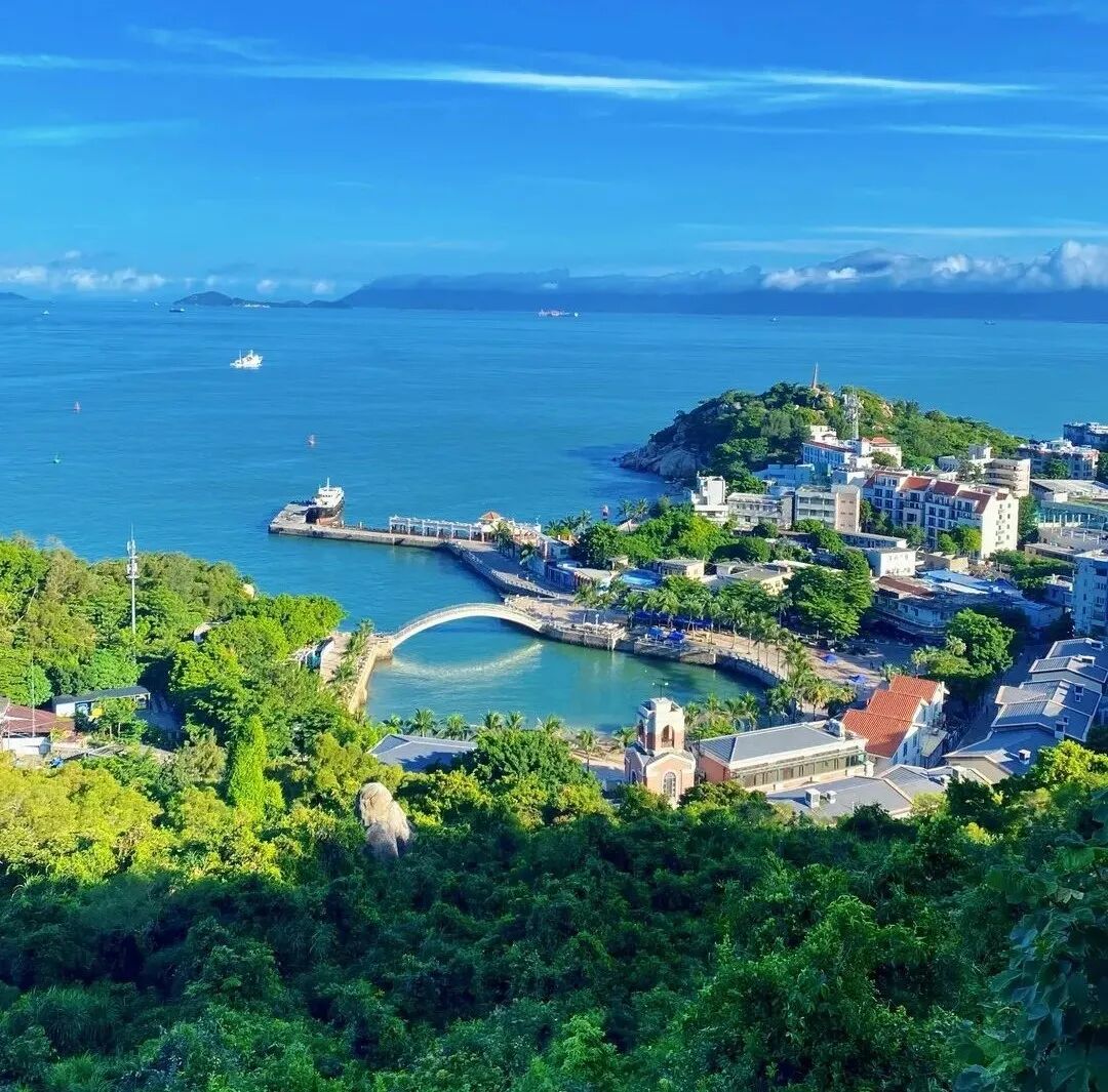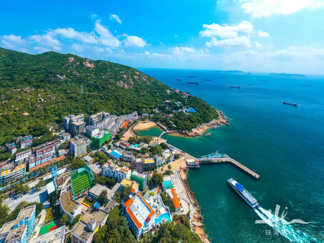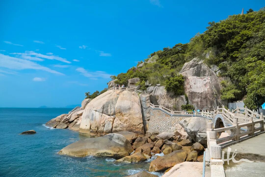 从外伶仃岛客运码头下船,一条精雕细琢的石阶小径便出现在眼前,小径盘绕在绿林和礁石之间,游客穿梭其中,倚栏凭海,赏霞绯映海。