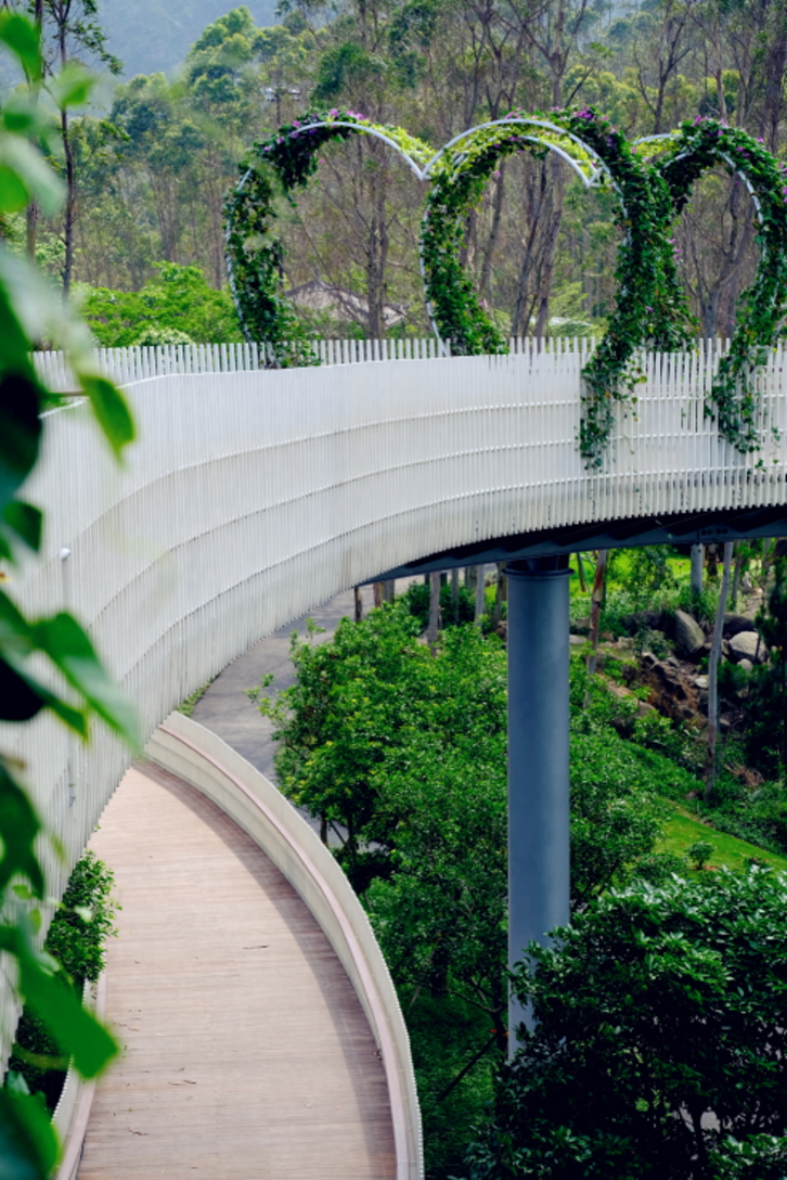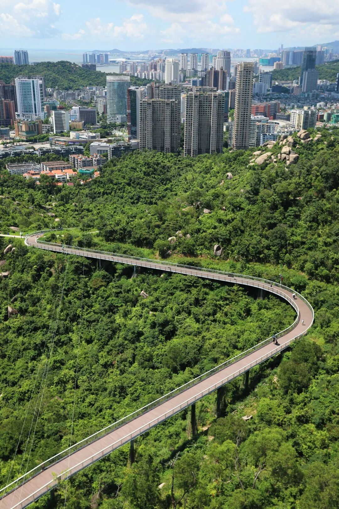 香山云道由香山湖公园可入,从空中俯瞰,绵延的步道似一条玉带盘旋于凤凰山,为整座山脉增添了几分生机。