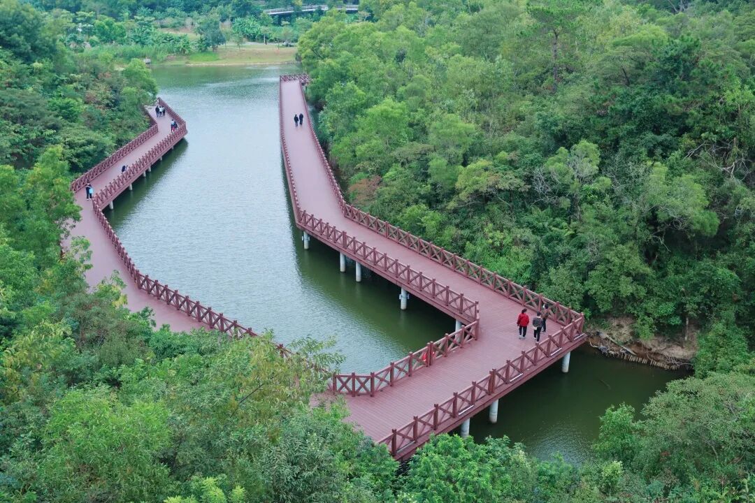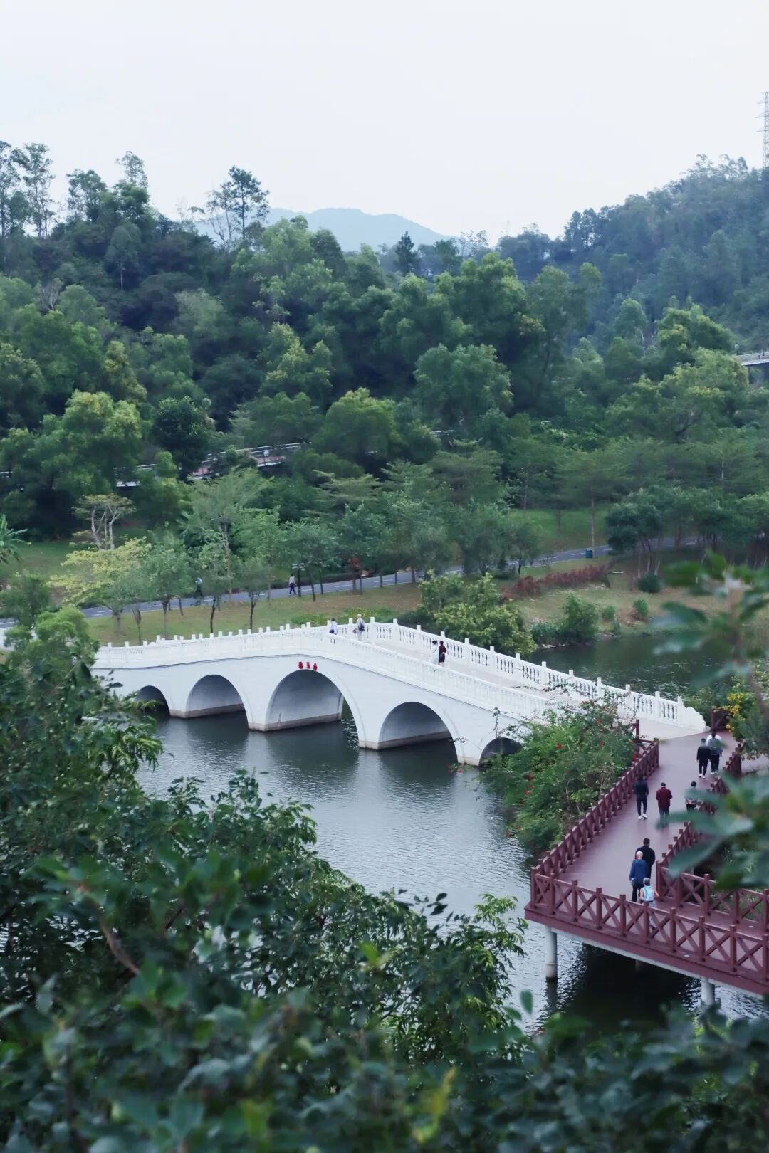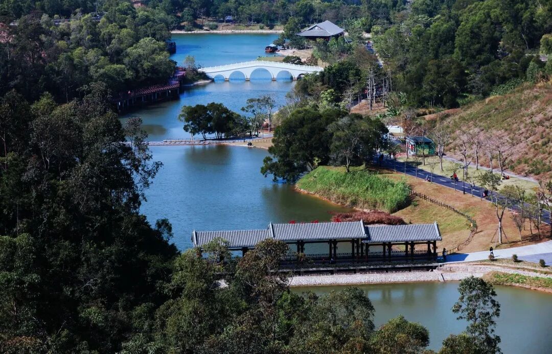 往步道深处走,青山环抱绿水,木质的围栏呈现的是典型的岭南风格。公园一侧是黄绿背水库,清澈的水面微风吹过,泛起阵阵涟漪,令人心旷神怡。