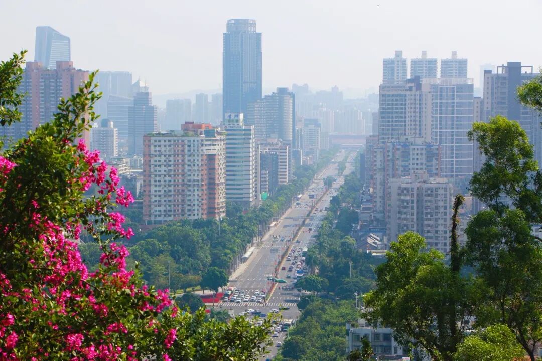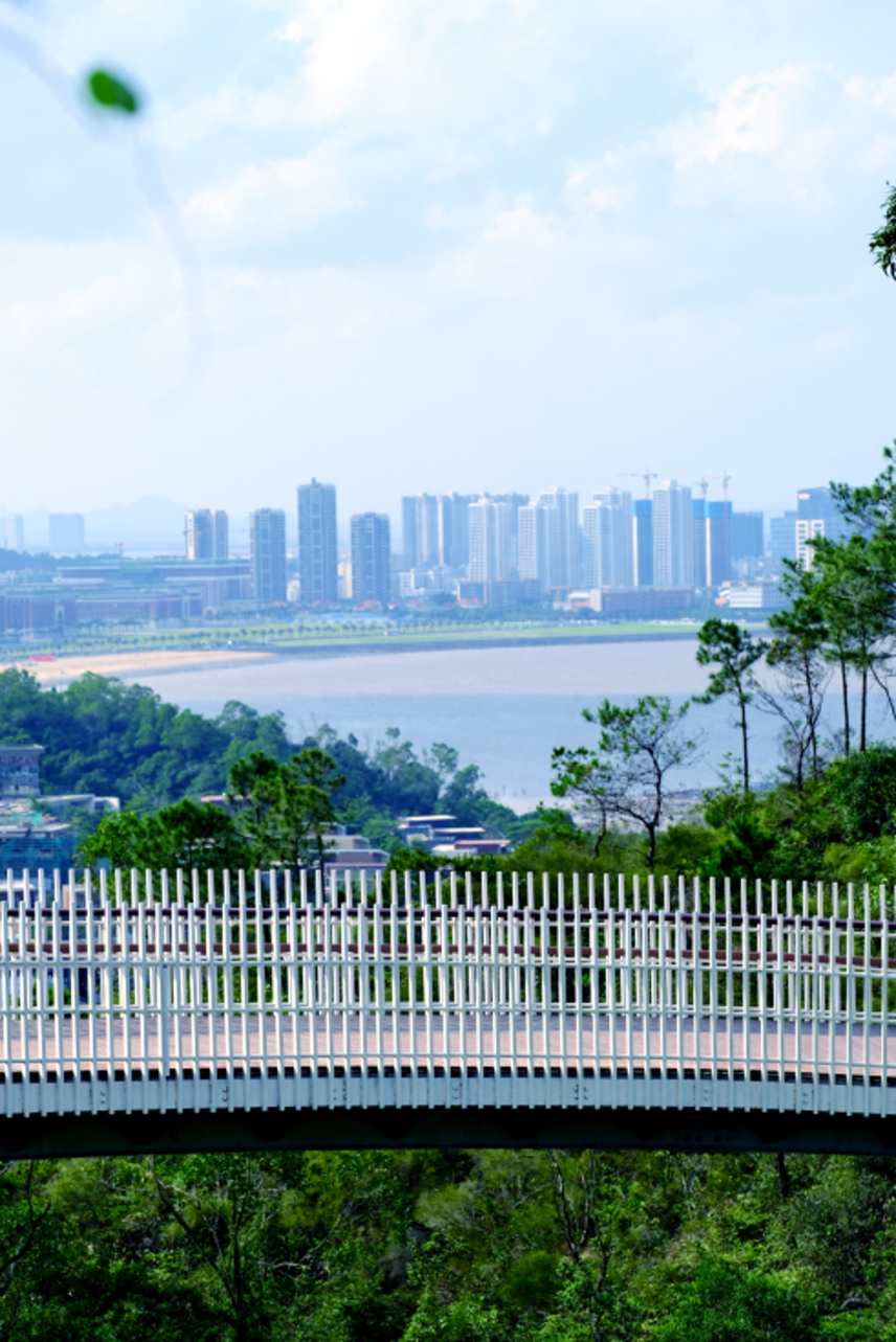 目光穿过草木,可以看见拱北迎宾路上,高楼林立、车水马龙。远处伶仃洋的碧波之上,港珠澳大桥宛若巨龙横卧其中,城市繁华在眼前触手可及。