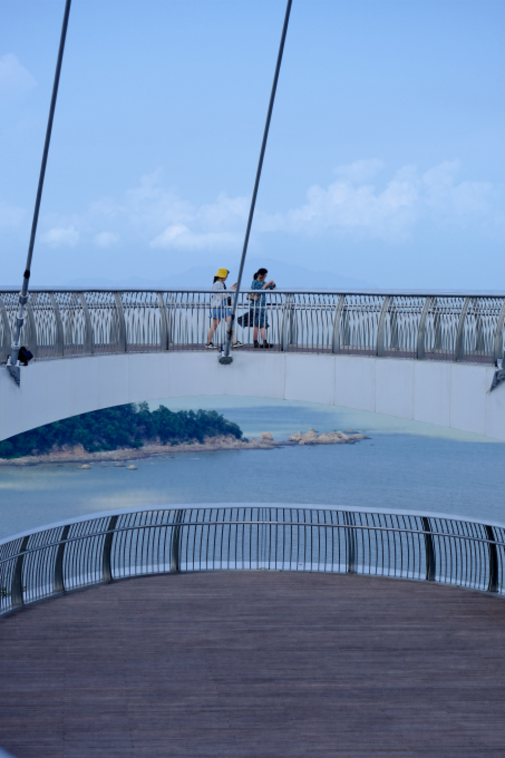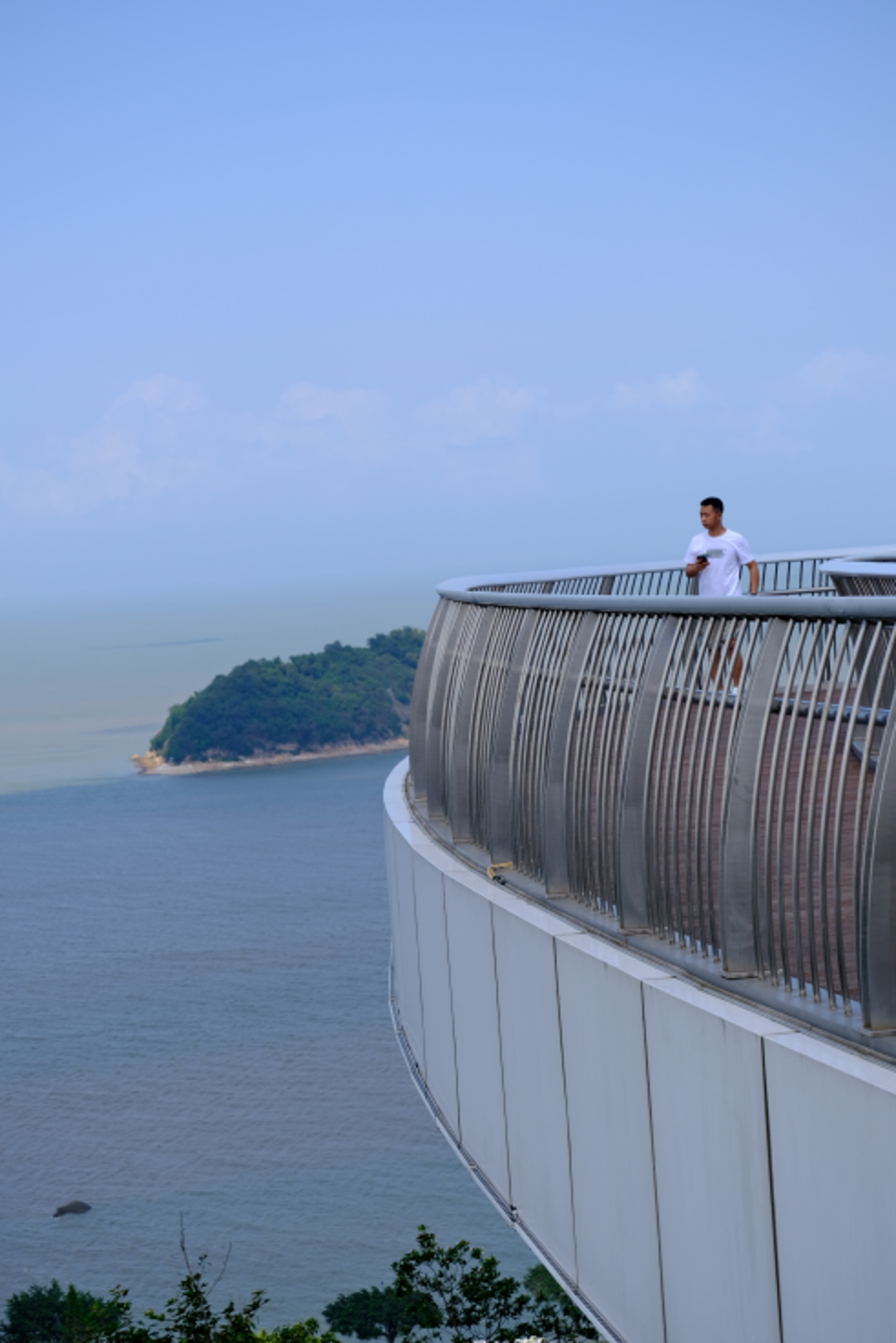 在步道的最高处——阅海观天观景台,呈双层结构,造型独特,似一艘即将起航的帆船,一望无际的大海近在眼前。脚下山峦叠翠,头顶万里晴空,悬于高空的人们仿佛置身于云端。