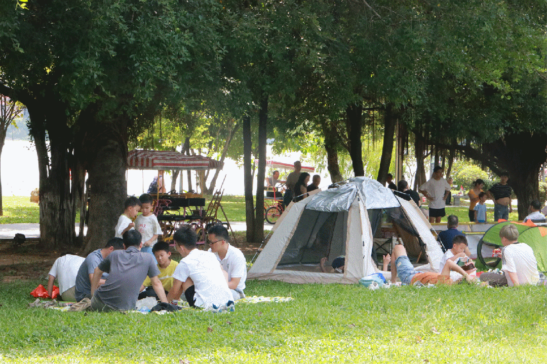 搭帐篷、户外运动……在草坪上,市民游客们支起各式各样的帐篷开始露营,感受自然和潮流文化的融合,度过悠闲惬意的假日时光。