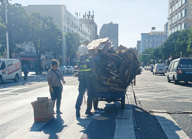 10月5日下午,巡警大队机动队员发现一位阿姨车上的纸皮散落,立即停车上前帮忙拾起并重新堆叠,阿姨对队员的帮助表示感谢。