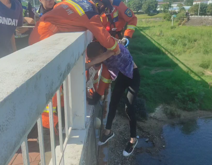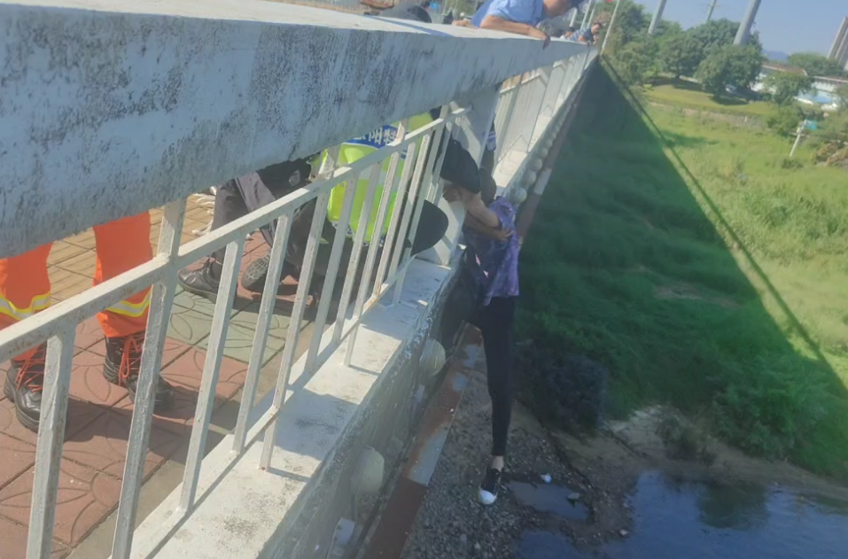 消防救援人员到达现场后发现,跳桥人员悬挂在桥外,脚踩在铁架上十分危险,已经到场的巡特警人员在桥面上牢牢抓着跳桥人员的双手。