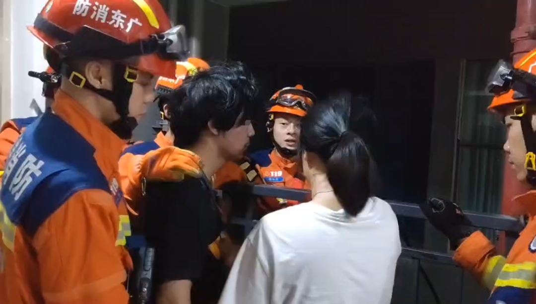 消防救援人员到达现场后经勘查发现,跳楼人员站在22楼空中走廊,其母亲在外牢牢抱着他,已经到场的巡特警人员在走廊上牢牢抓着跳桥人员的双手,情况十分危急。消防员到场后立即穿戴全身吊带并做好个人防护,跨出围栏使用腰带与安全绳对跳楼人员进行保护,最终将其救下。
