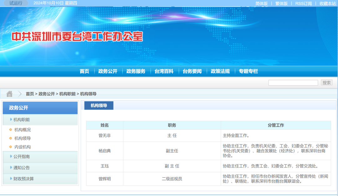 奥一新闻获悉,日前,深圳市委台湾工作办公室官方网站机构领导一栏信息更新,显示曾无非已担任深圳市委台湾工作办公室(市政府台湾事务办公室)主任,主持全面工作。