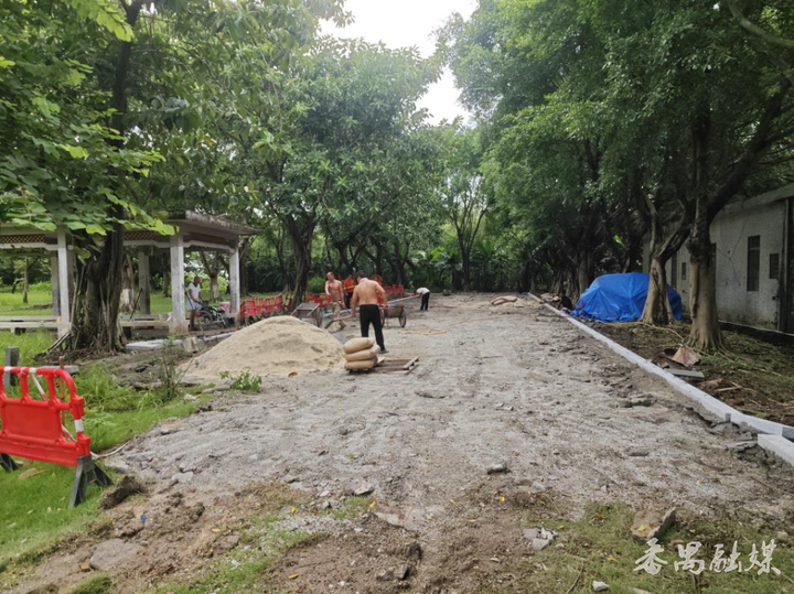 公园重新铺设水泥基础和平缘石现场
