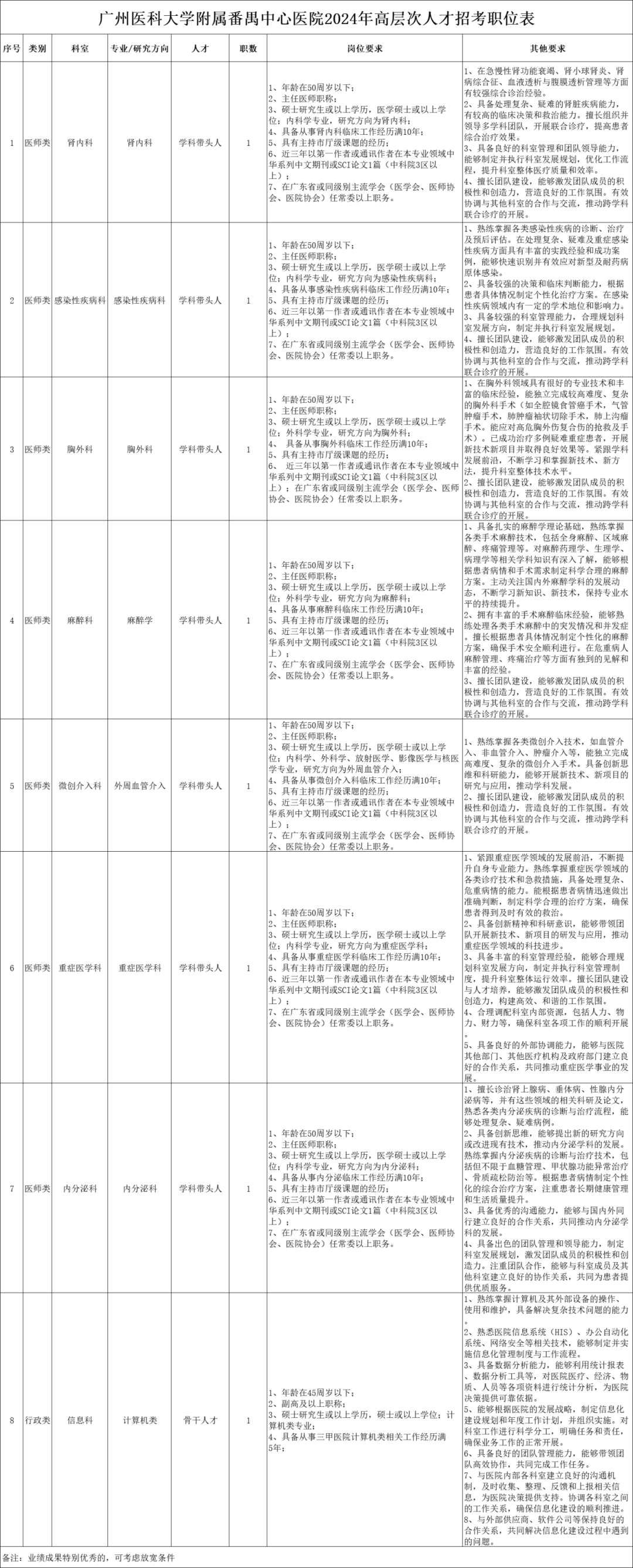 1.学历学位及年龄要求:具有研究生学历、硕士学位或以上。医师类岗位要求具有正高级专业技术资格,年龄在50周岁以下;行政类岗位要求具有副高级专业技术资格,年龄在45周岁以下。