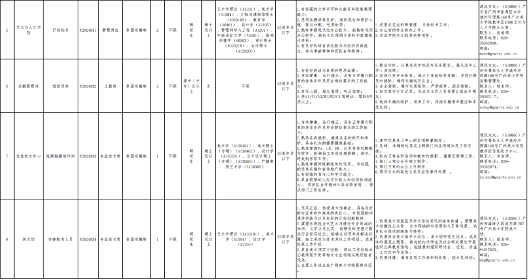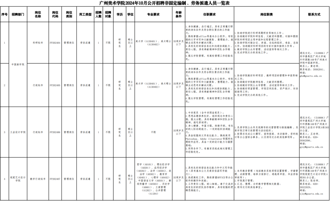 7.报考岗位所需的其他条件,详见《广州美术学院2024年10月公开招聘非固定编制、劳务派遣人员一览表》。
