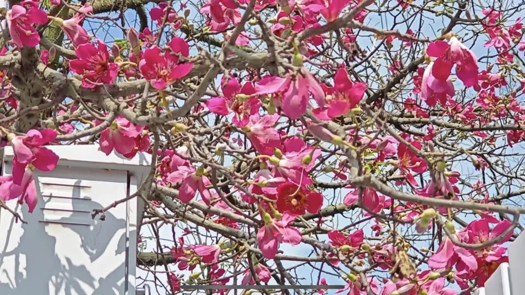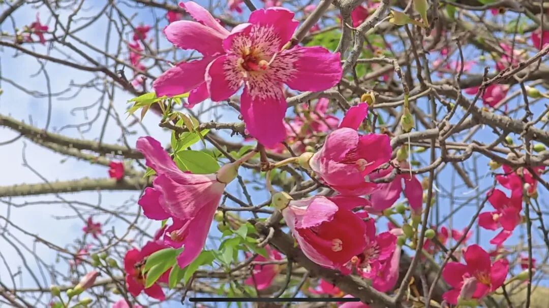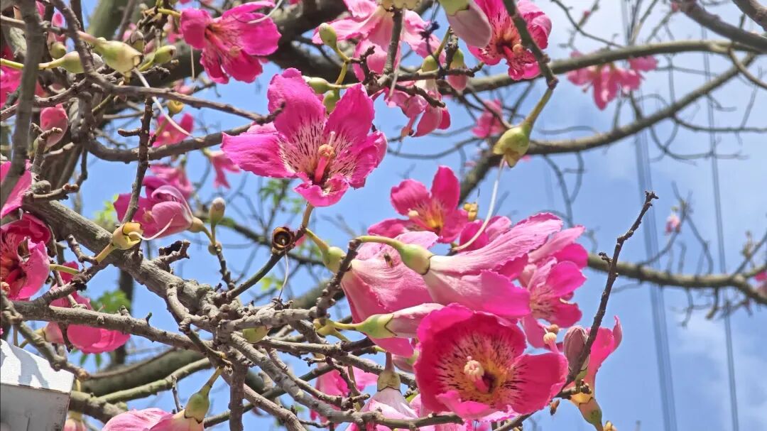 在东城路和柏兴三路交汇处,人行道上的一排异木棉相继迎风盛放,一半繁花、一半绿叶,粉红的花朵点缀枝头,绚丽多姿。