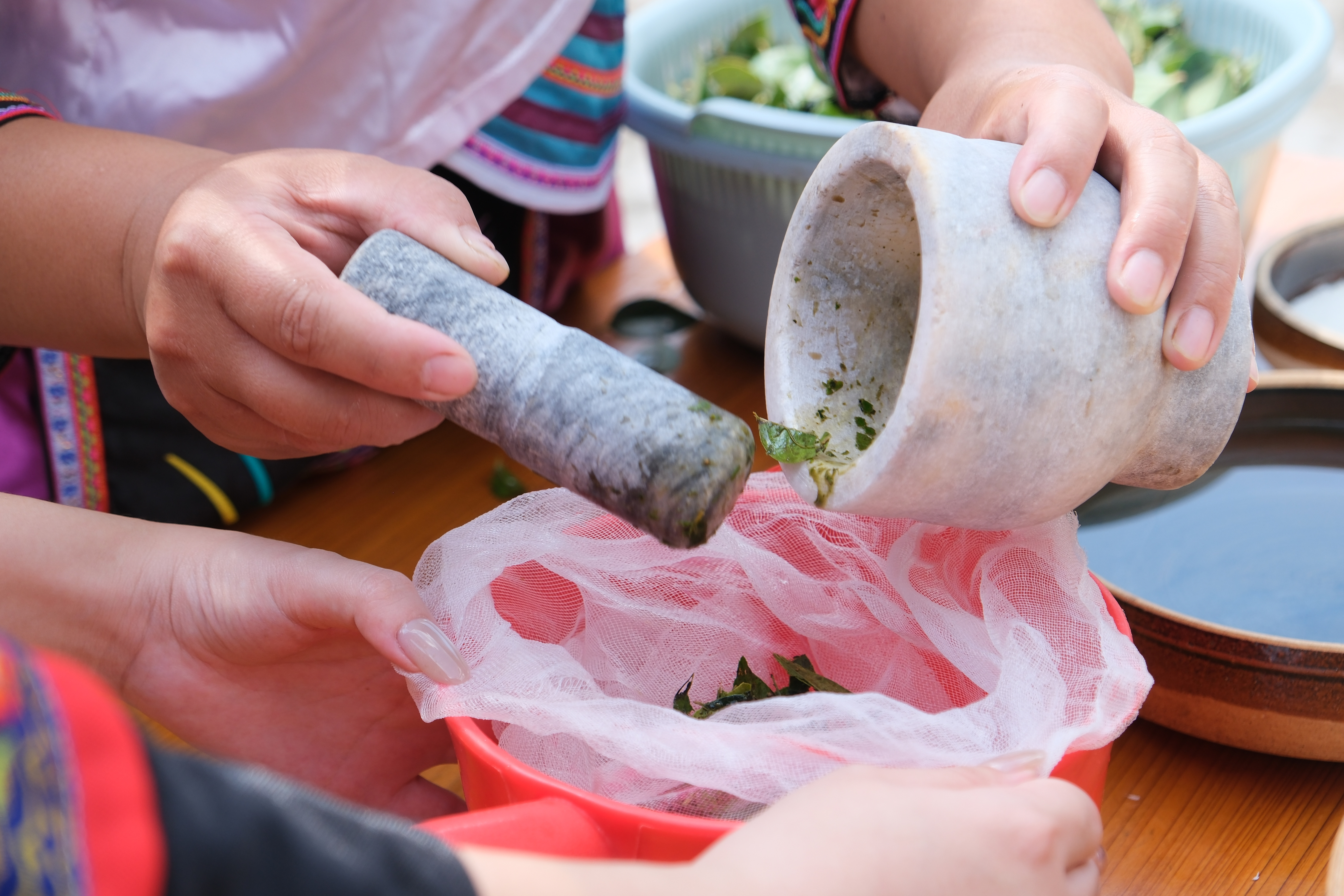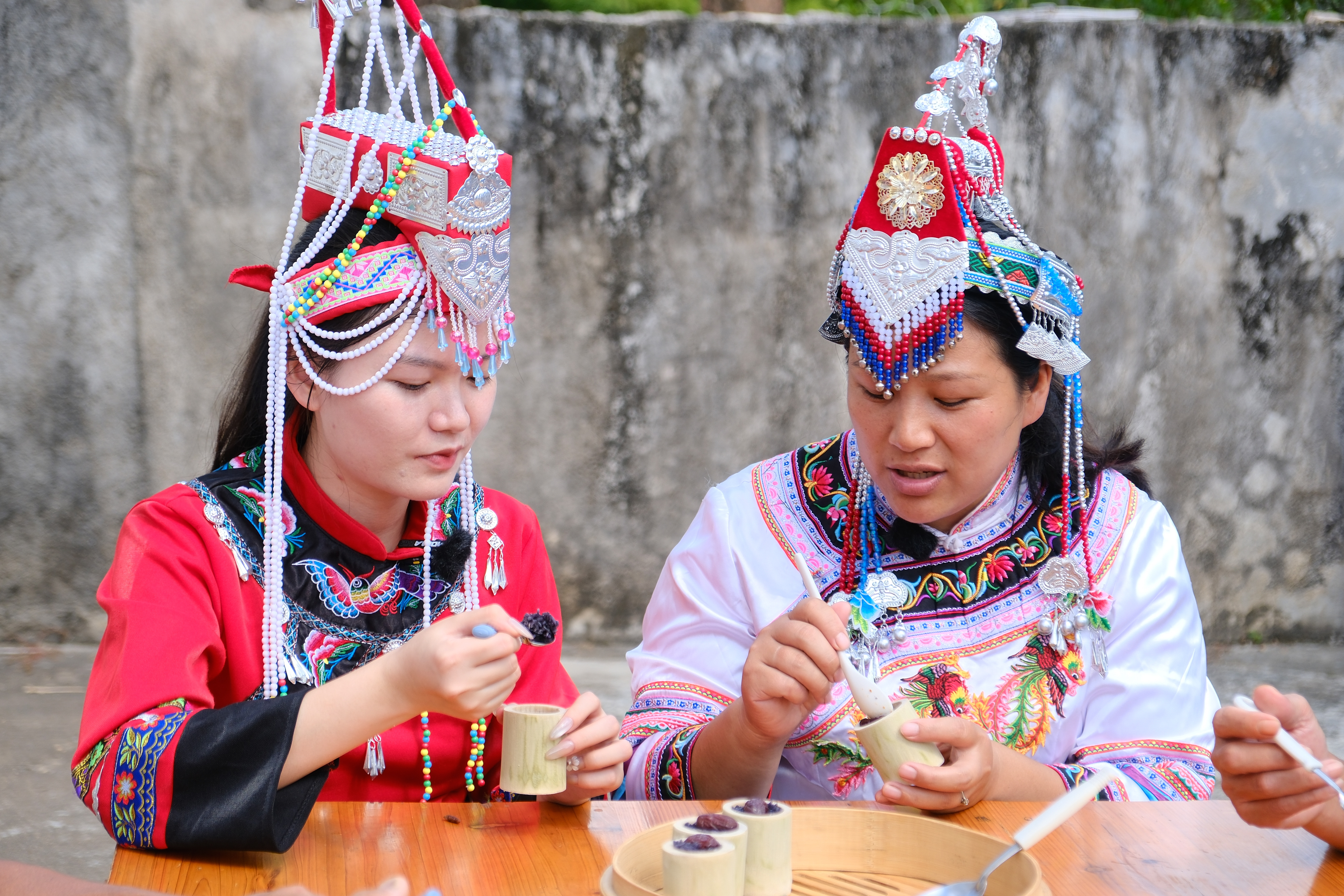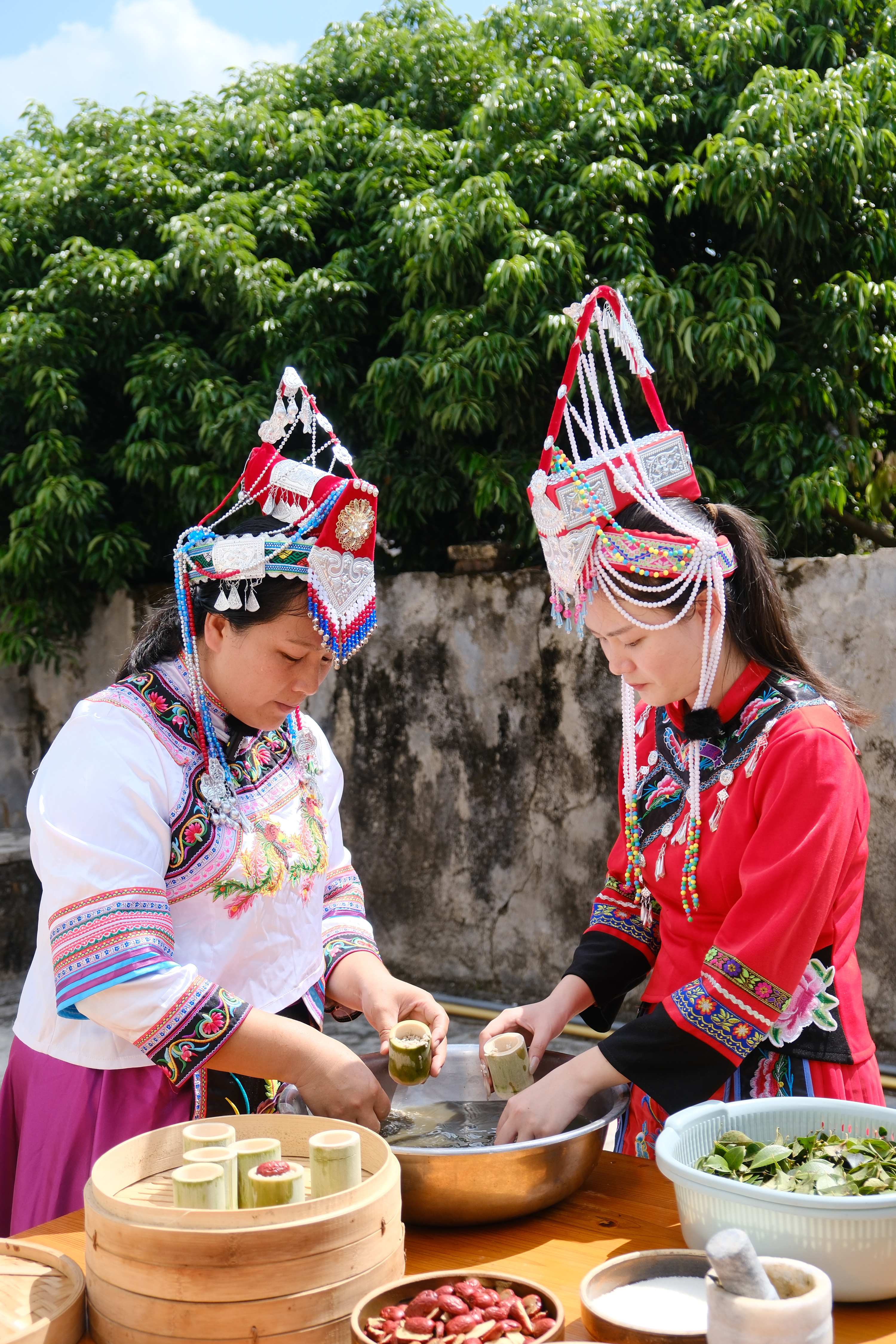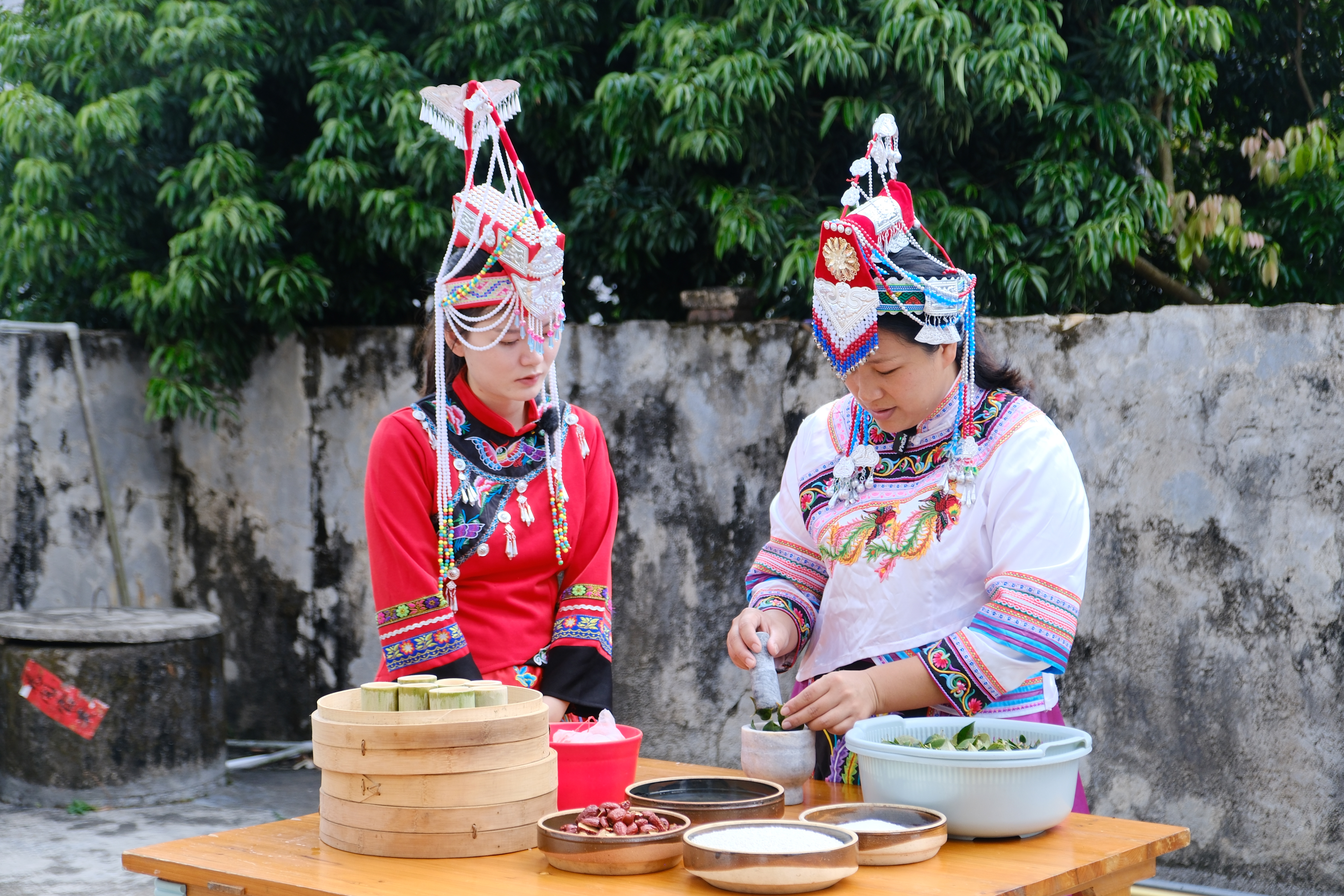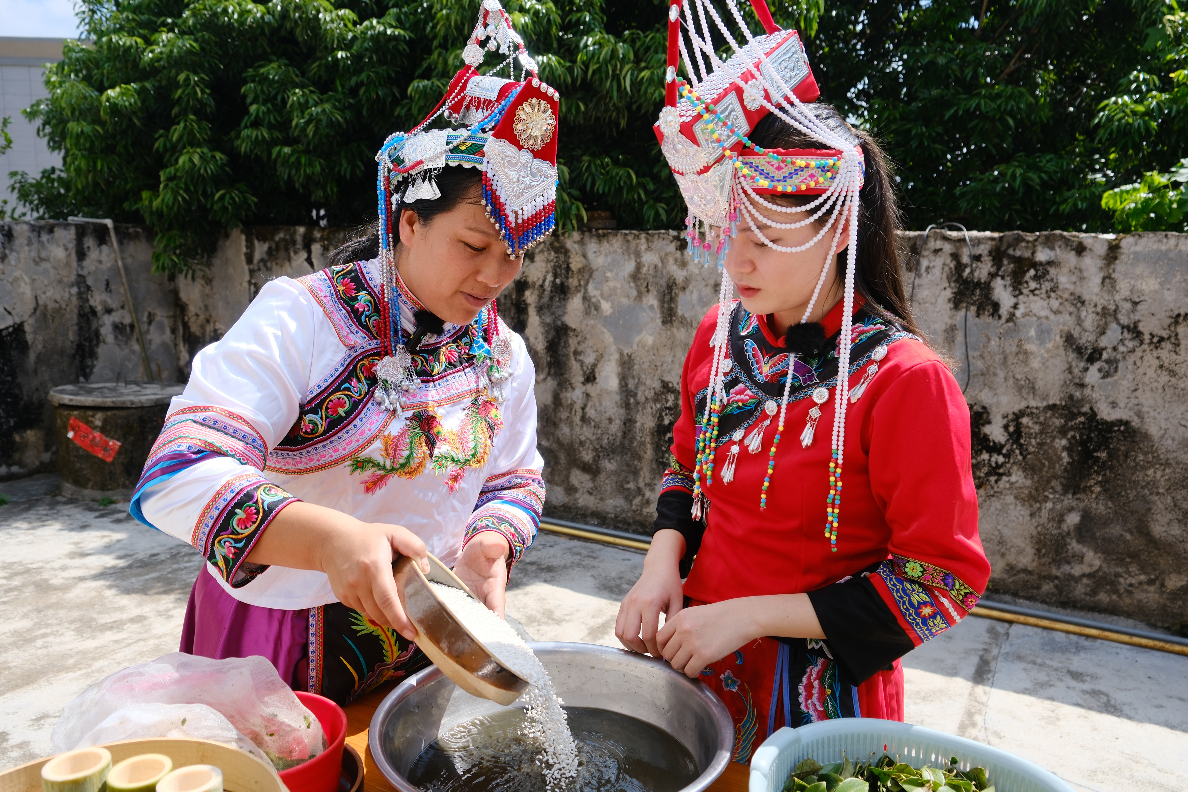 乌稔树树叶一点点在传统石臼中碾碎出汁,这汁液便是糯米的天然“染色剂”。“畲族特色传统美食‘乌米饭’,并非市面上的黑米,而是将乌稔树的叶子捣烂滤汁,浸泡白糯米染制而成。”甘陂村村民蓝碧娟介绍道。
