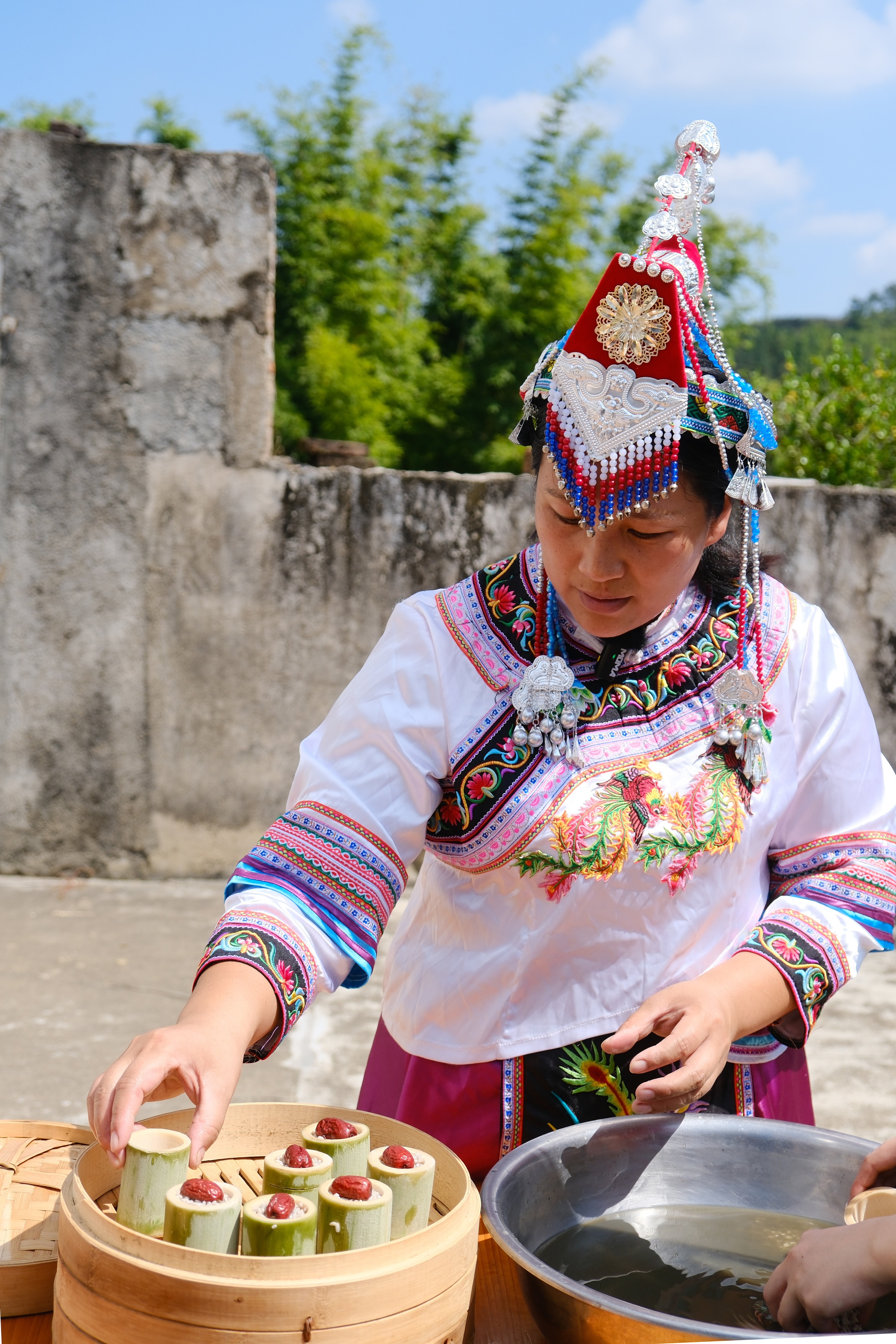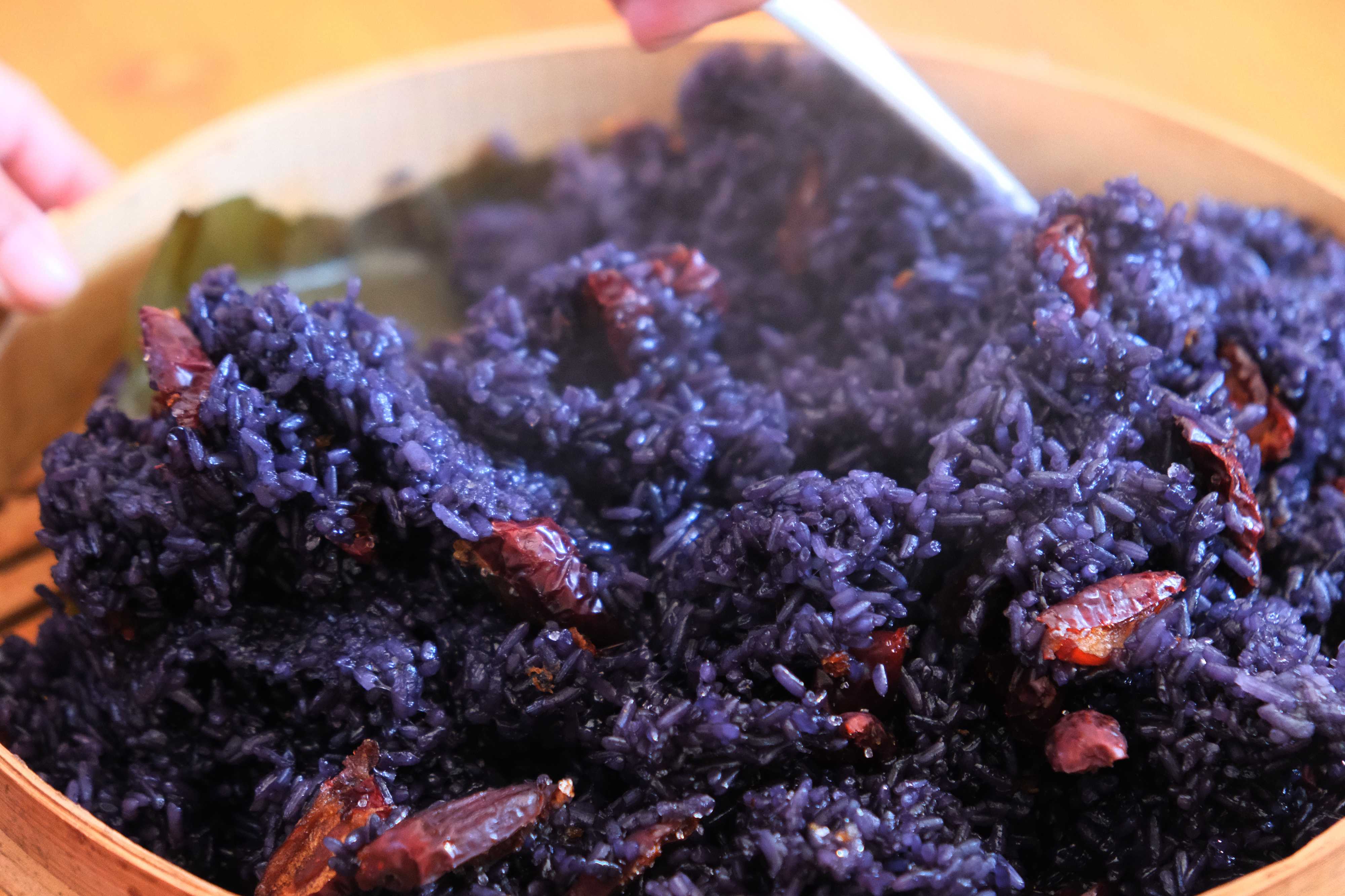 蒸熟后的乌米饭,黑中泛青,放凉咀嚼,糯韧绵软。配上红枣、白糖,感受独有的清香,喜欢咸的,加入腊肉、豌豆、笋片等各色食材,创造出一种全新的味觉体验。天一热,吃起来尤为清爽。单独吃糯米不易消化,但加了乌稔树汁的乌米饭却不会,老人、小朋友也适合吃。