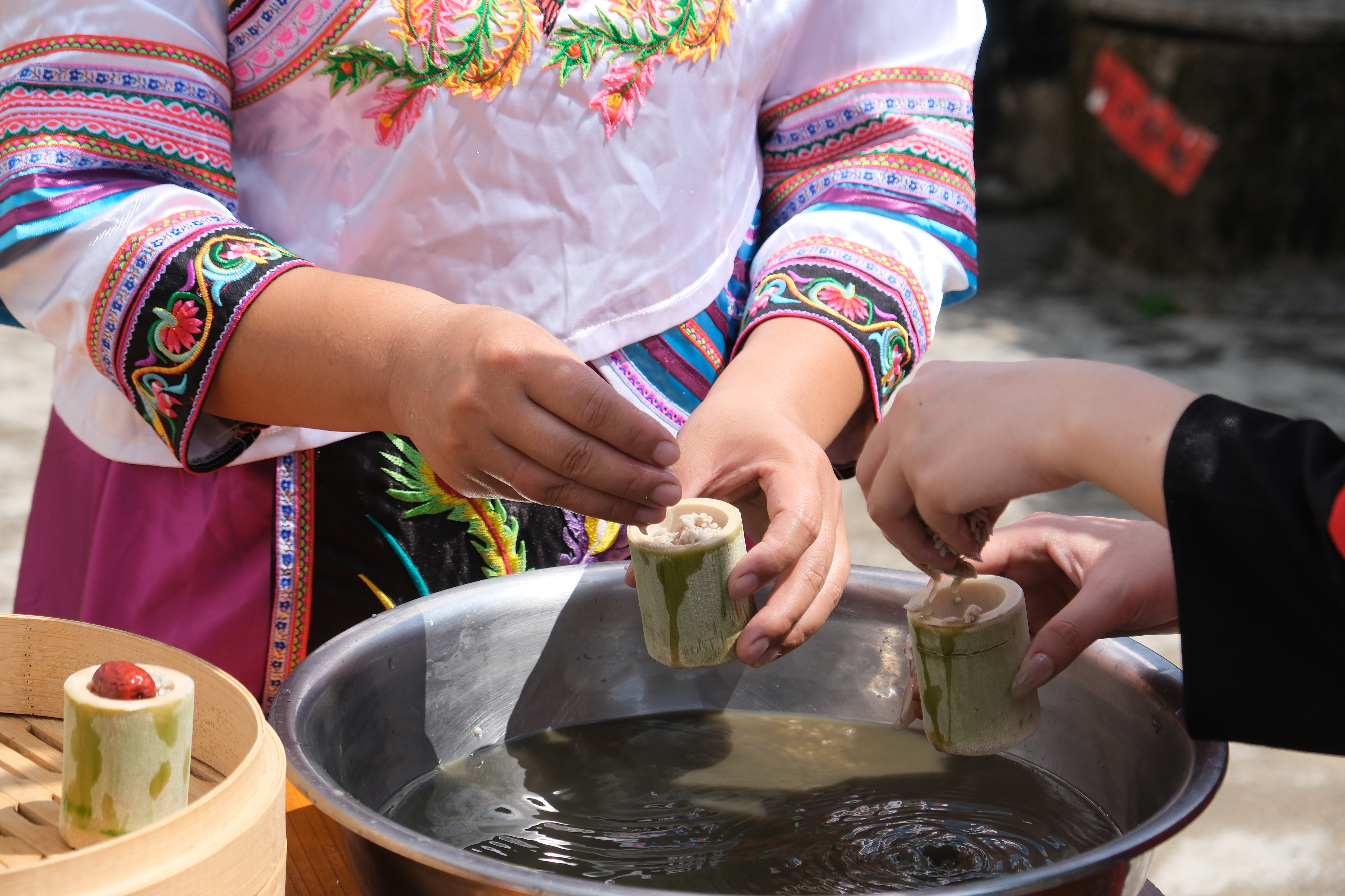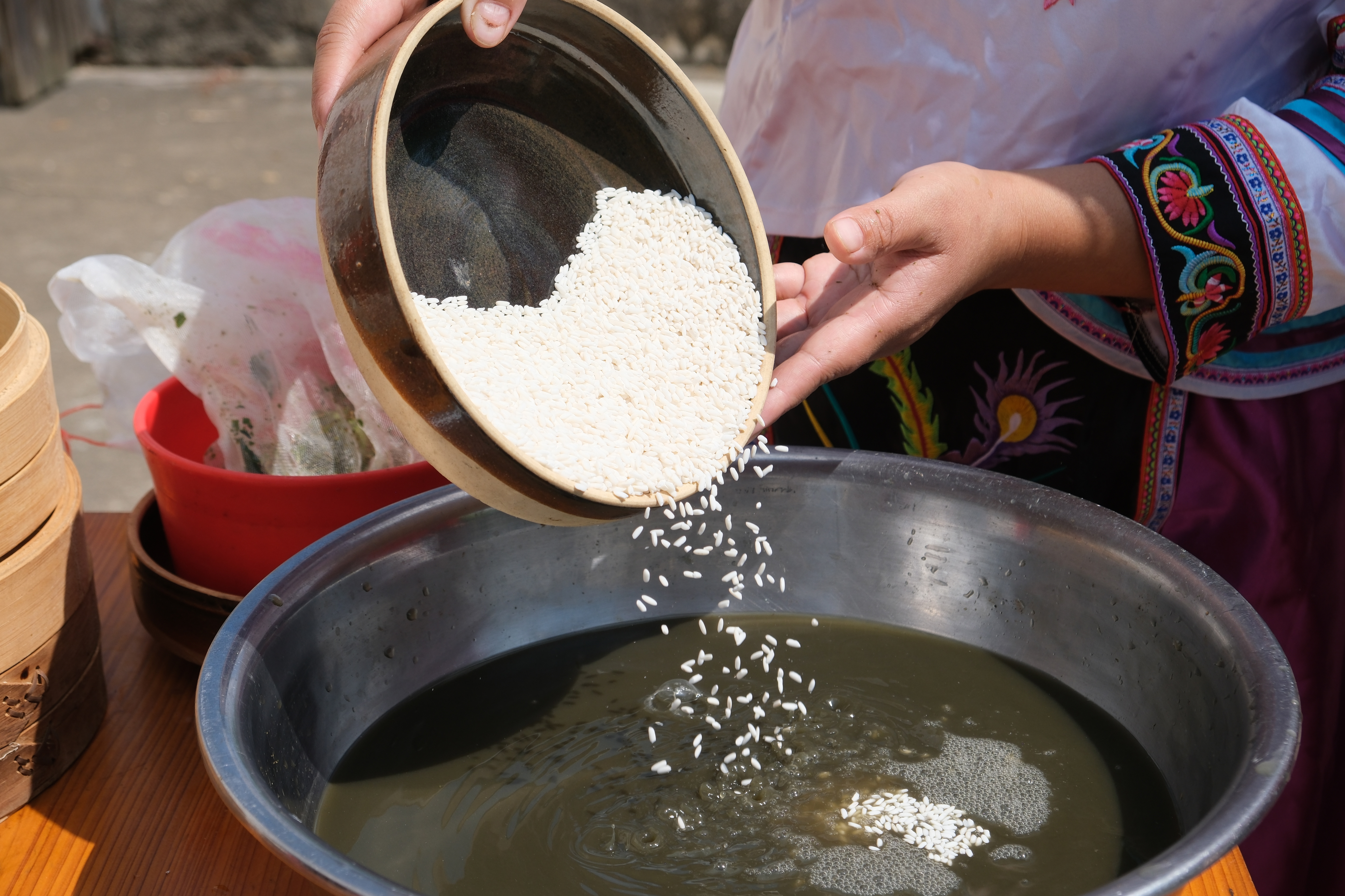 再将白花花的本地糯米倒入其中