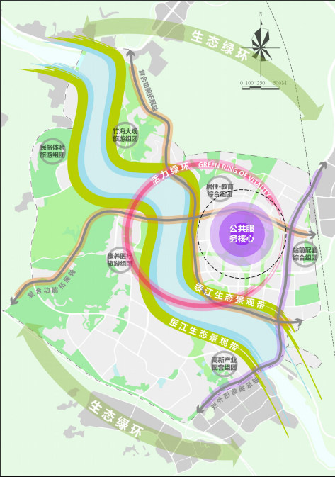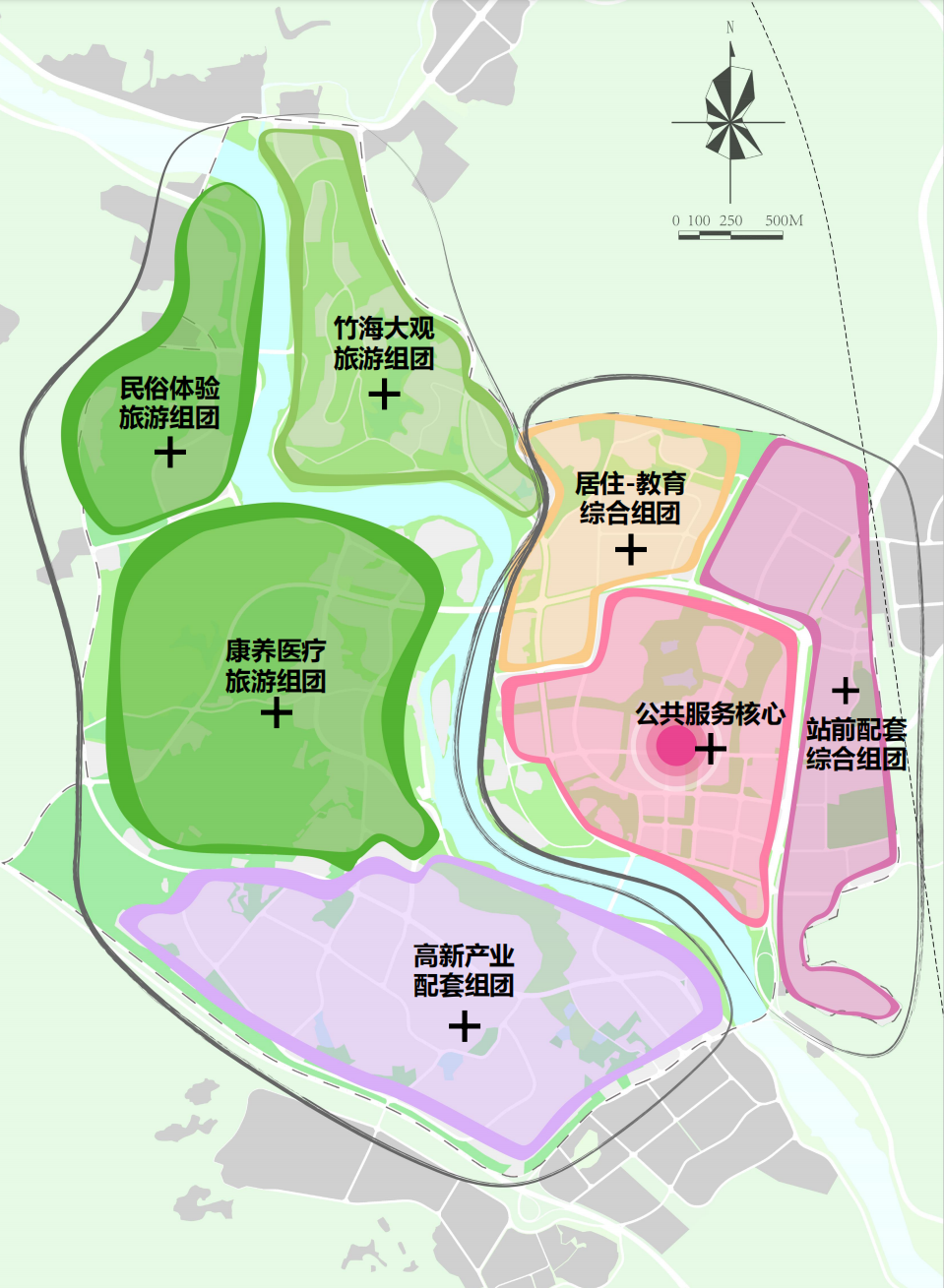 围绕公共服务核心,整体将形成旅游产业、都市生活两类大的功能区。其中可细分为居住-教育综合组团、站前配套综合组团、高新产业配套组团、康养医疗旅游组团、民俗体验旅游组团、竹海大观旅游组团共6个功能组团。