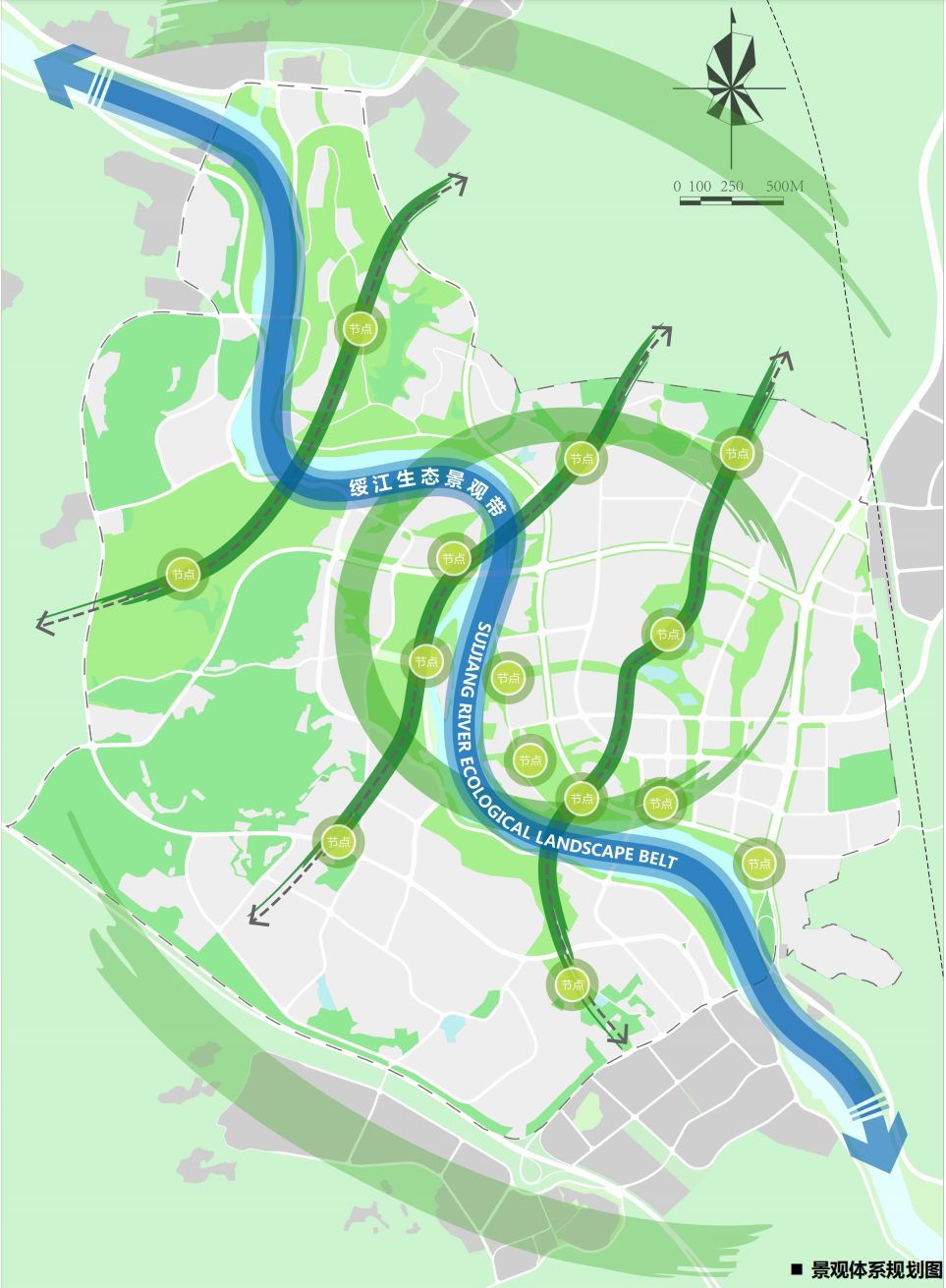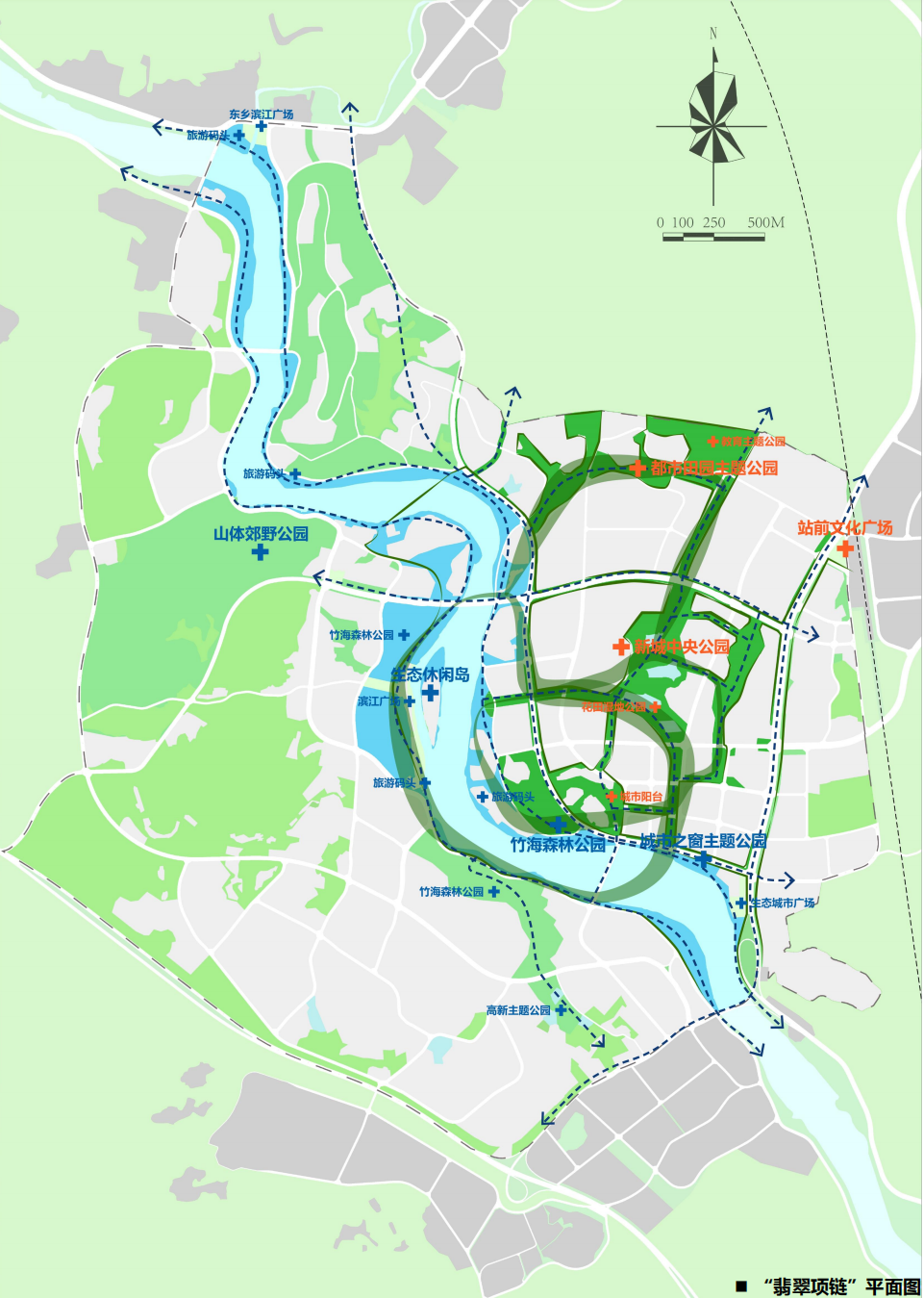 以翡翠项链公园群为组织公共生活的纽带,构建“翡翠项链-都市绿环” ,联通绥江两岸区域,引导城市向纵深发展。