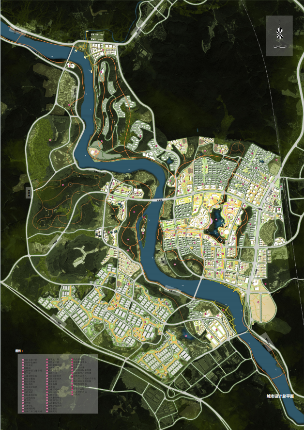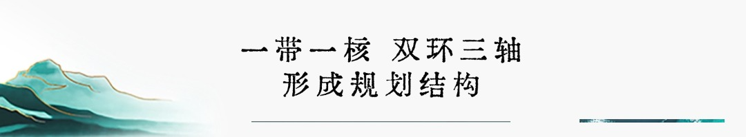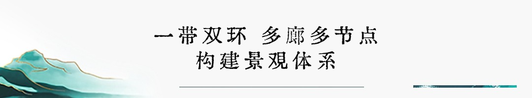 双环——呼应新城坐落于群山环抱之中,规划区外围两岸山体环绕形成生态绿环(外环);规划区内部多元功能串联形成活力绿环(内环);