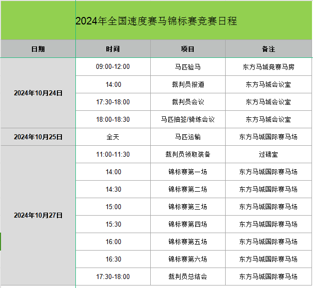 通知表示,2024年全国速度赛马锦标赛将于2024年10月27日在湖北省武汉市东方马城国际赛马场举行。