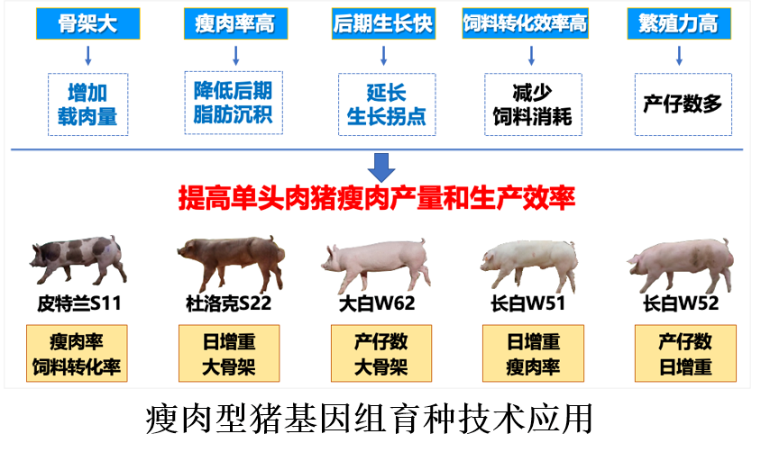 此外,基因组育种技术在瘦肉型猪本土化选育中应用,加快了种猪遗传改良进展,培育种猪新品种。构建了瘦肉型猪基因组选择参考群体9.5万头,建立了基因组育种技术标准化操作流程和开放共享平台,应用于12个瘦肉型猪专门化品系的本土化选育,实现了断奶前的早期选择。