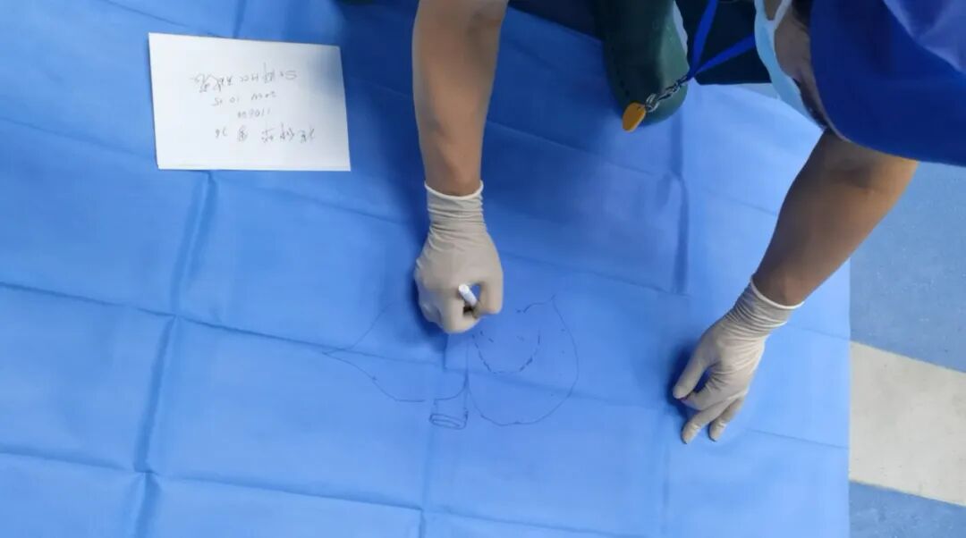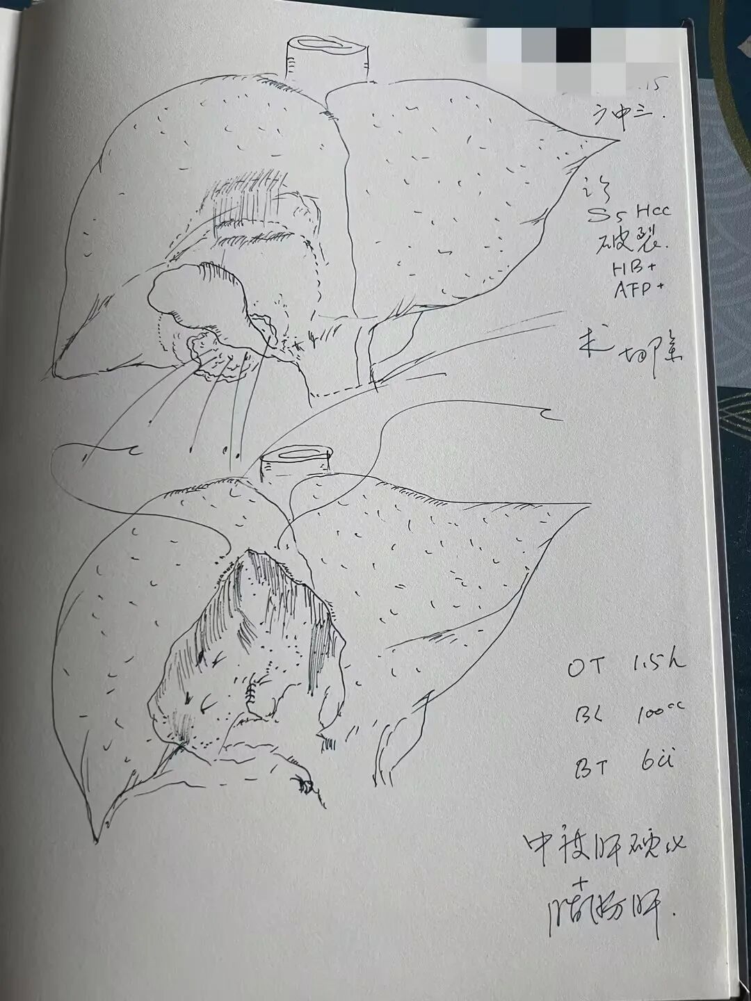 值得一提的是,术后陈涛教授在现场作画,将患者的肝部情况以图画的形式展现出来。从这幅画可以清楚地看出肝脏的大小、形状以及肿瘤的位置和切除范围,即使是未参与手术的医生或患者家属,也能一目了然地了解患者病情和手术情况,助力病情沟通。