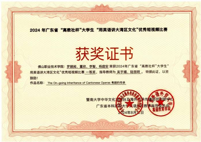 近日,我校文化旅游创意学院学生罗颖闻、董欣、李智、杨庭安在公共基础教学部外语教研室吴宇媚和陆丽明老师的指导下参与了2024年广东省“高教社杯”大学生“用英语讲好大湾区文化”优秀短视频比赛,荣获高职组一等奖。