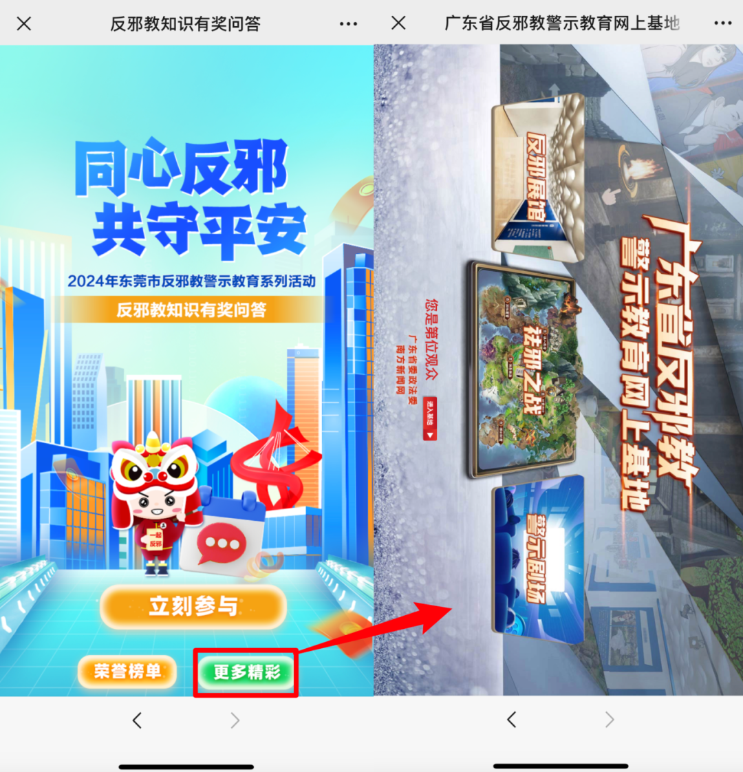 ②与此同时,市民在进入H5界面后,点击“更多精彩”,可以进入“广东省反邪教警示教育网上基地”,参观“反邪展馆”,参与“祛邪之战”,观看“警示剧场”,不但能了解更多反邪教知识,而且有奖知识问答很多题目的答案也在其中。