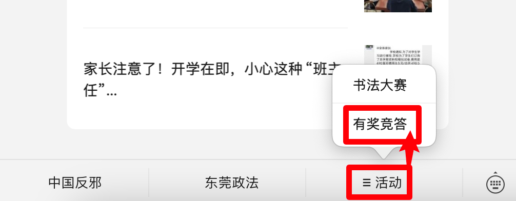 ①关注“东莞反邪”微信公众号,点击下方菜单栏中的“活动”——“有奖竞答”即可进入本次活动平台进行答题;